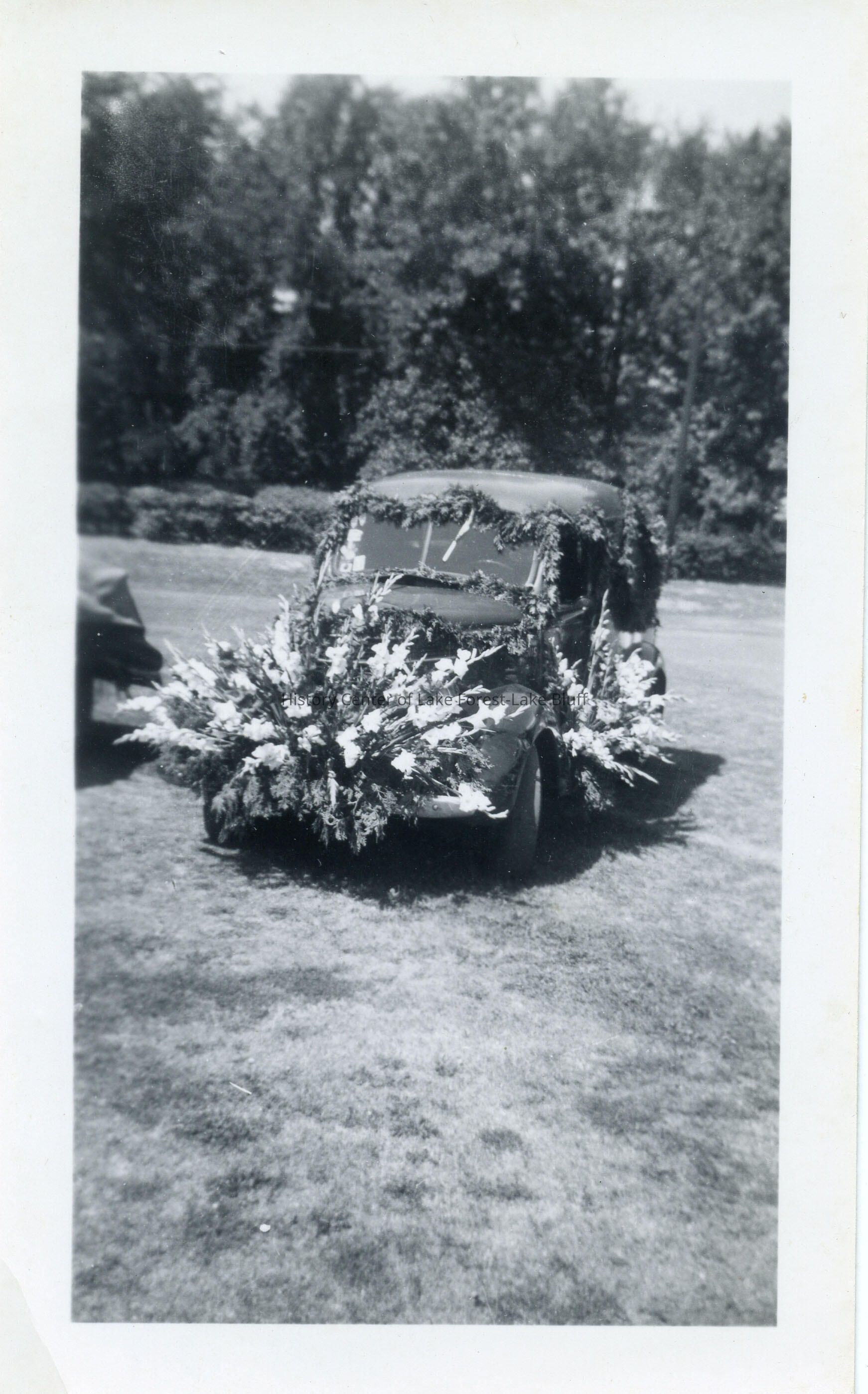 Automobile decorated with sprays of flowers. Note on back reads "Car Herman decorated." Herman is probably florist Herman Jahnke.
