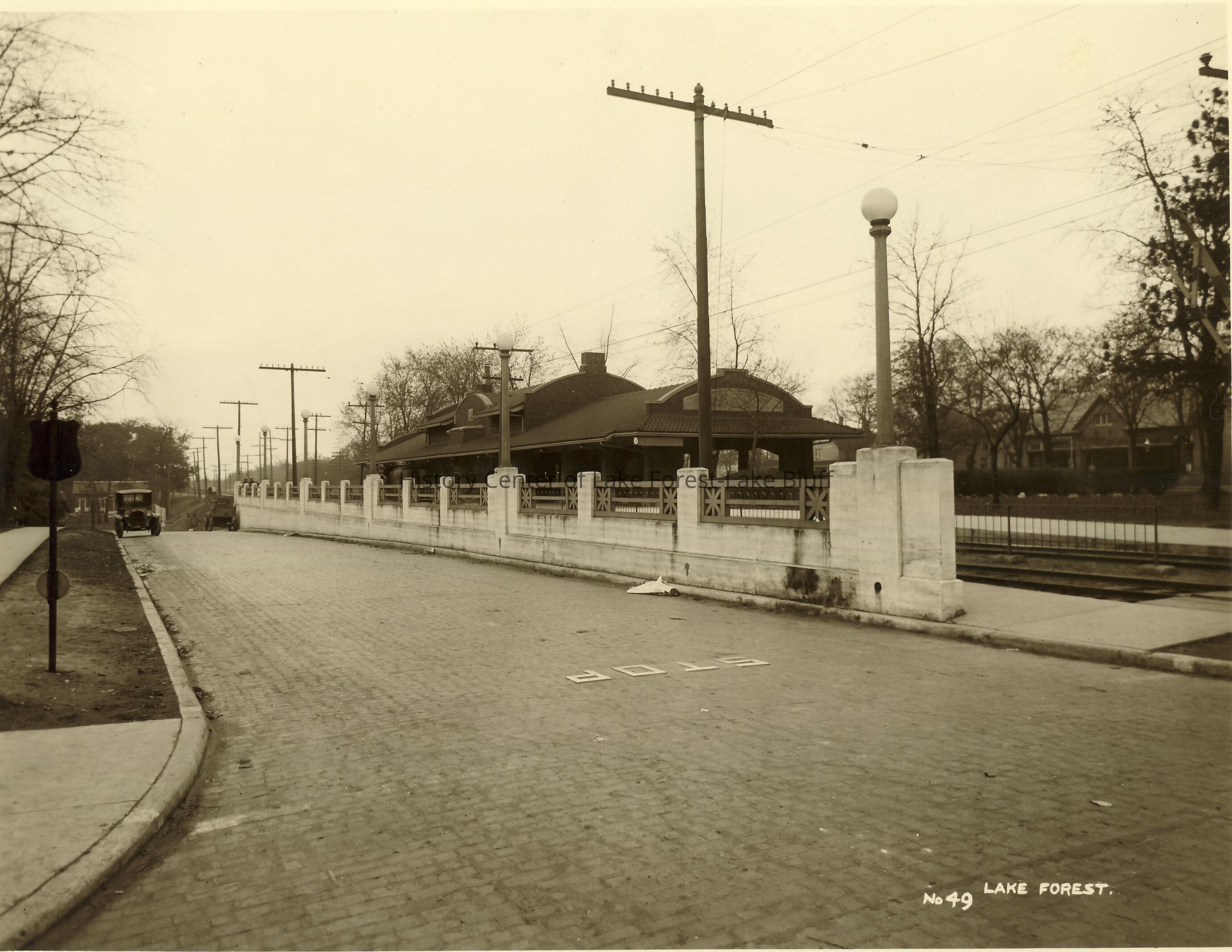 Shore Line route - North Shore Line Route - Lake Forest Deerpath and McKinley, brick street on McKinley, looking south toward Illinois - Lake Forest station Chicago North Shore & Milwaukee Railroad ca. 1923