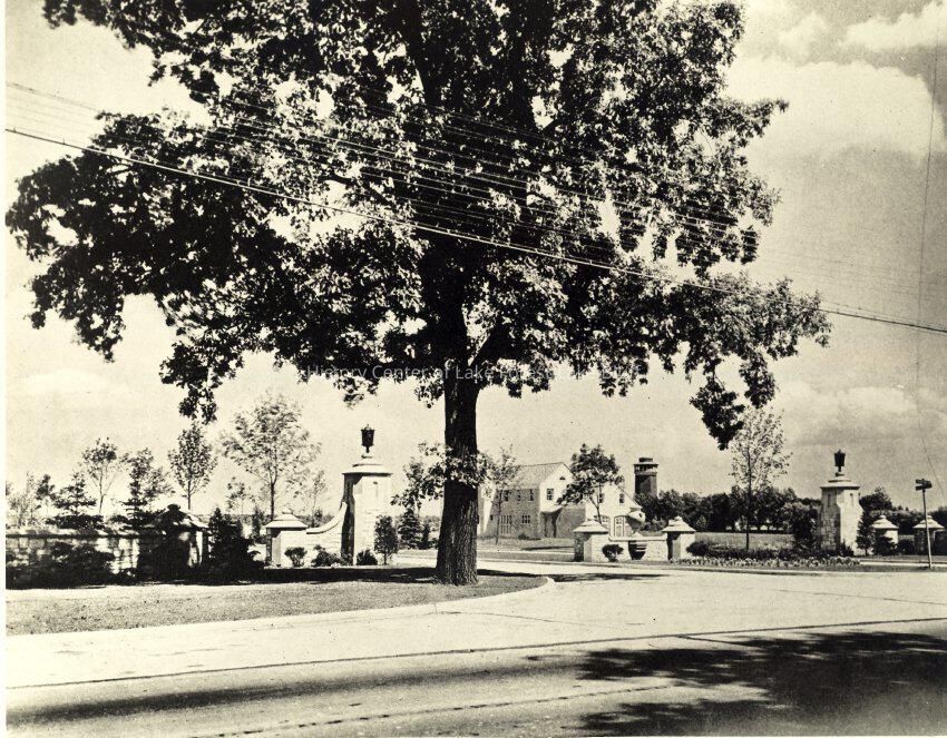 entrance gateway of Castlegate Court at Waukegan Road. This stone amenity was constructed as part of the Deerpath Hill Estates subdivision.