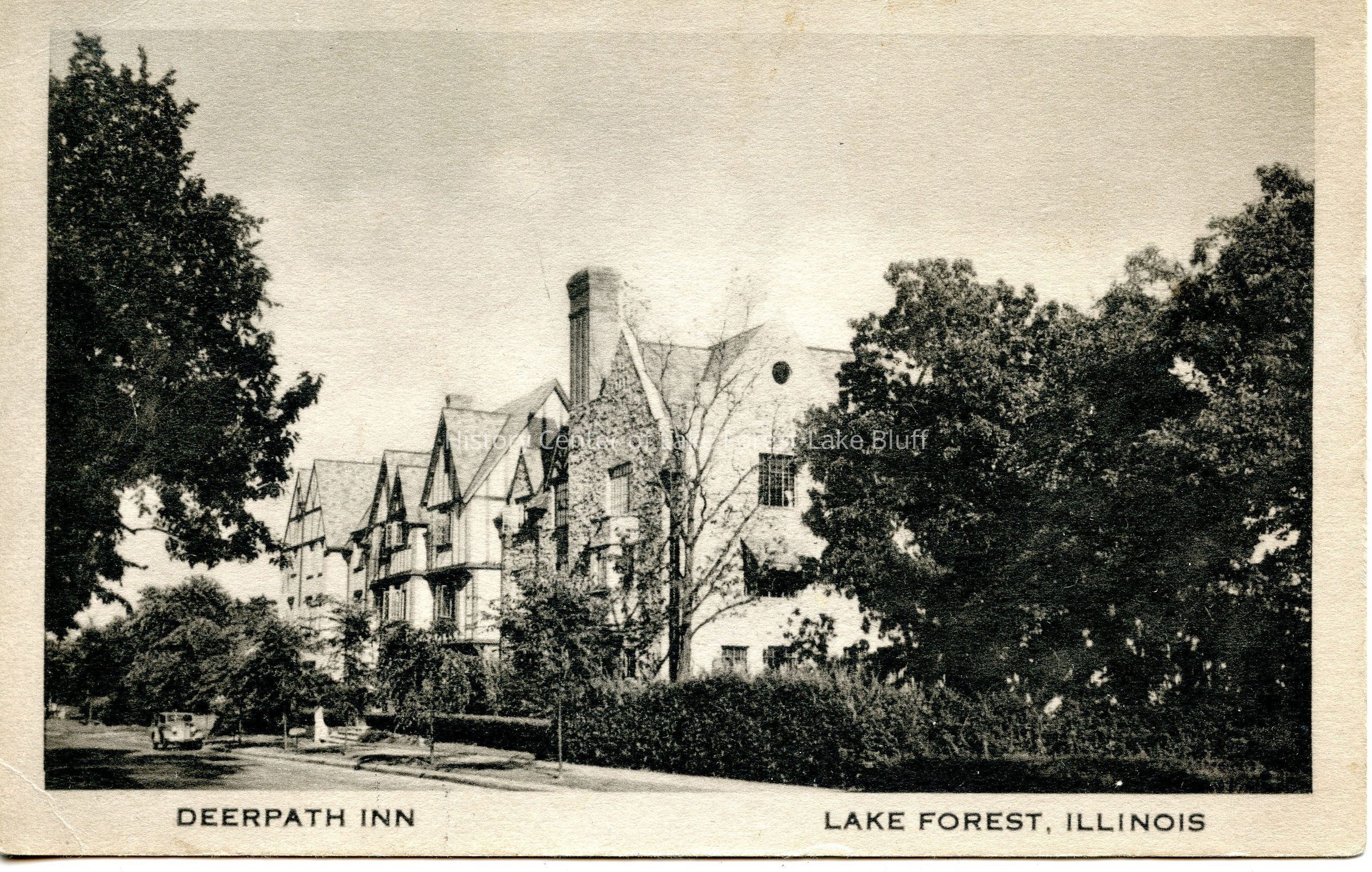Postcard c. 1930 of Deerpath Inn. Note on reverse is from Arthur Pollack: "Unable to attend LFHS account accident to horses in tramp out."