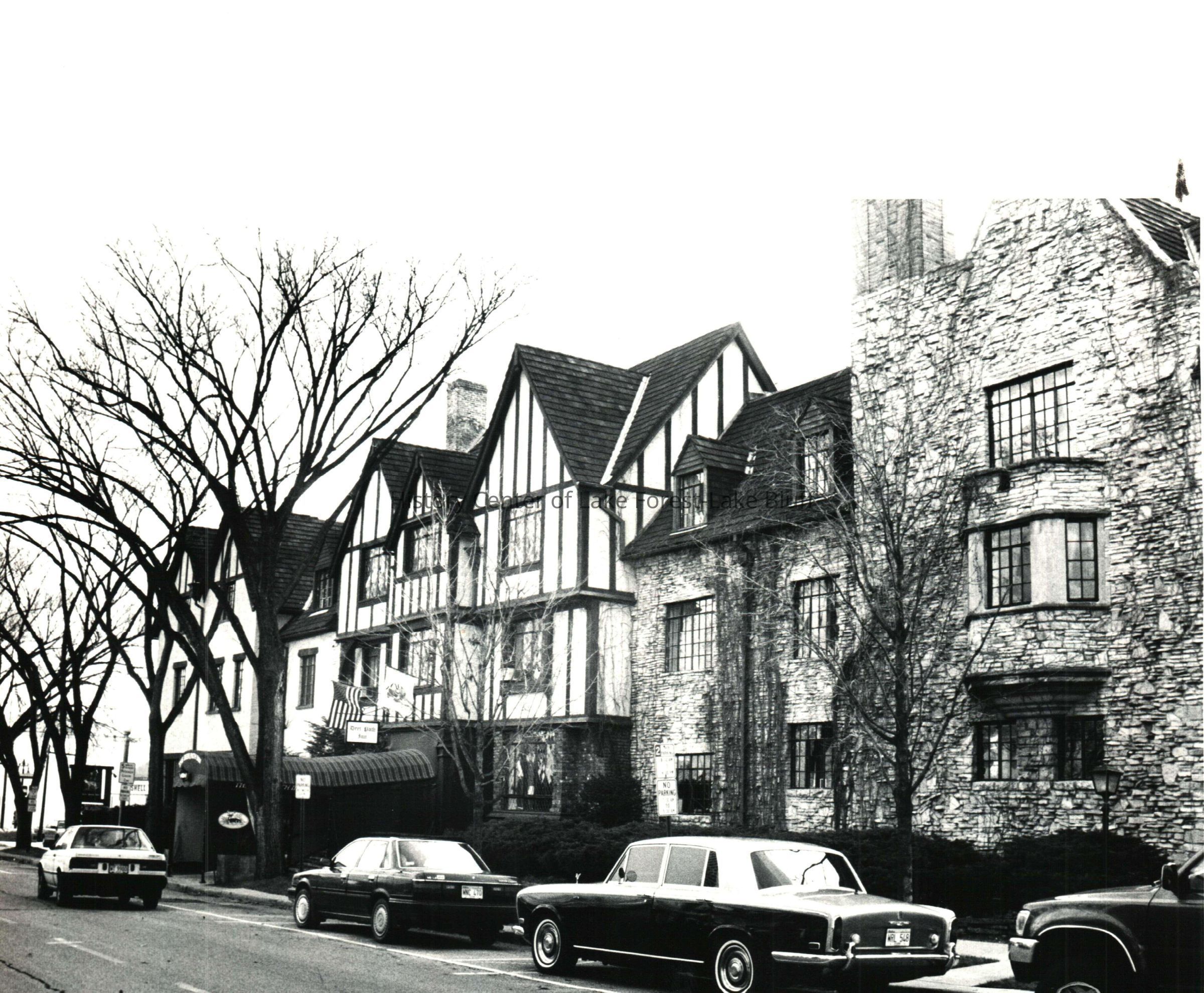Black and white photo of the Deerpath Inn and parked cars