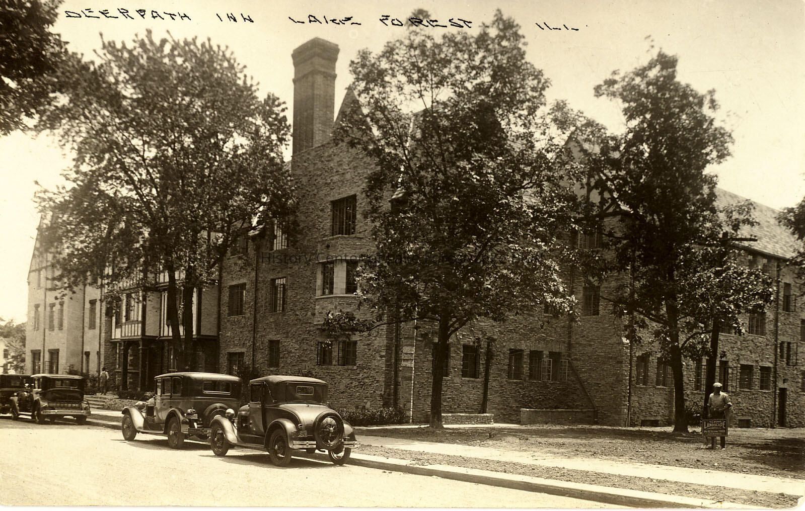 Black and white post card of Deerpath Inn, circa 1920s-1930s. Period cars are parked along street and a man is standing in the yard behind a sign. reverse is blank