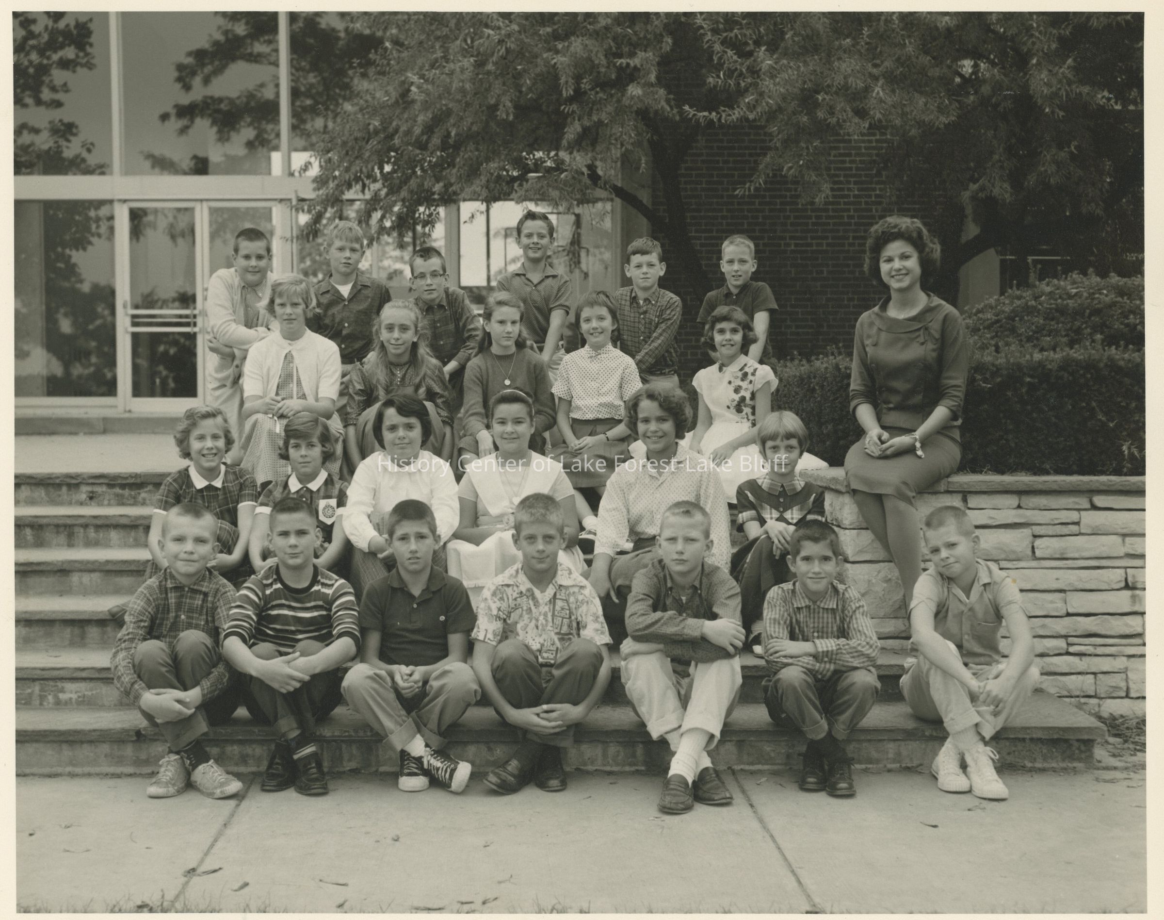 Unlabeled but most likely taken at the front entrance of Deerpath Middle School c. 1960. Back of photo has a label which reads: