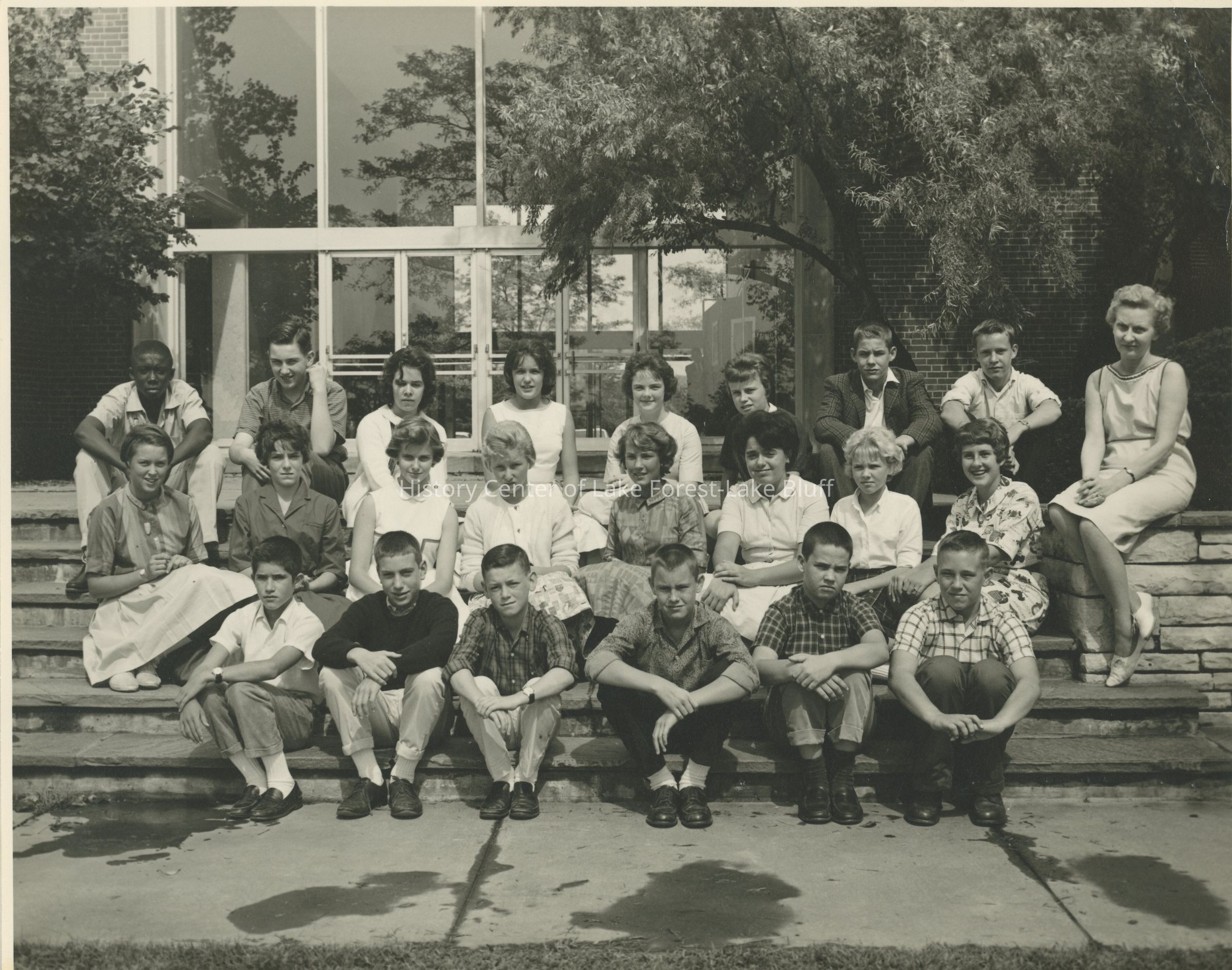 Unlabeled but most likely taken at the front entrance of Deerpath School c. 1960. Back of the photo has a stamp which reads: