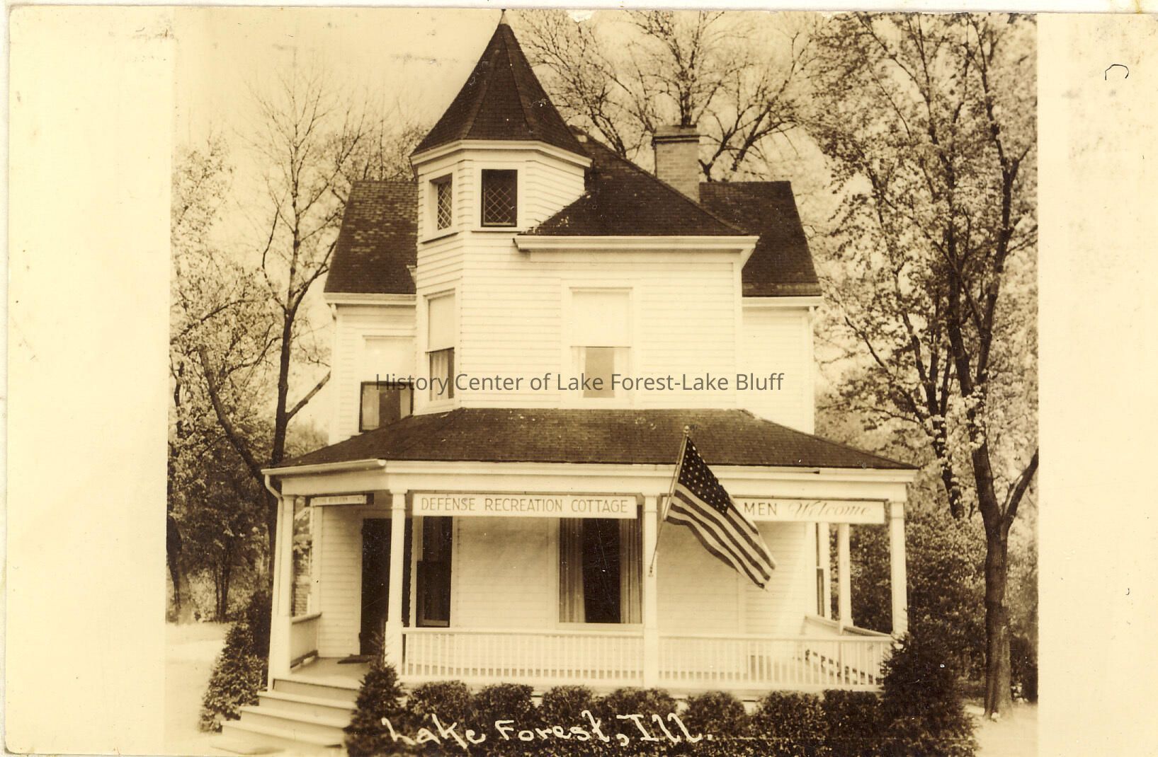 Encapsulated postcard with a view of the Defense Recreation Cottage in the 1940s. Banner on porch reads "Men Welcome." Back reads, "McKinley and Deerpath across from old North Shore Station. U.S.O. LF Defense Recreation."