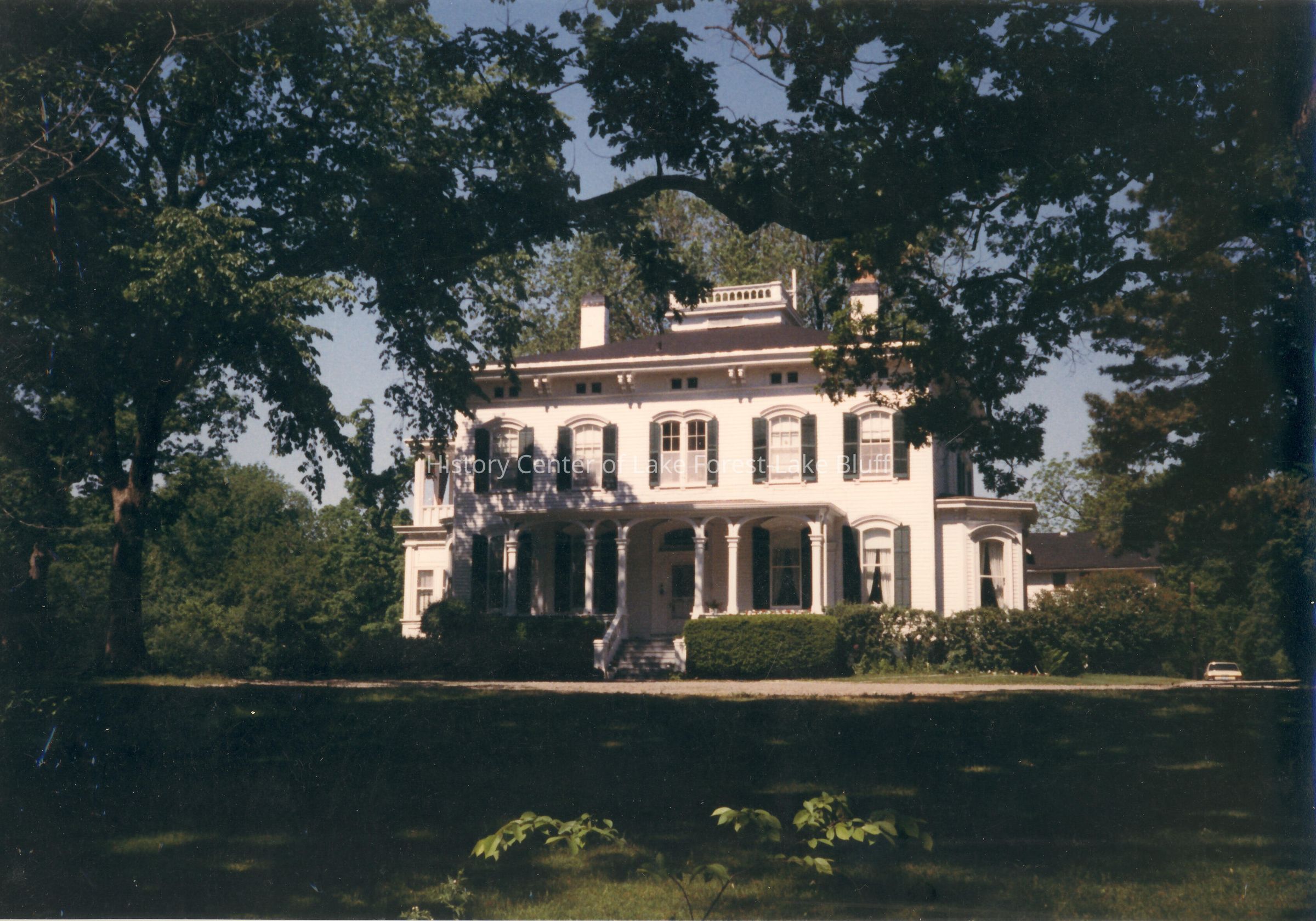 Color image of the Holt house surrounded by trees in full leaf. porch is in shadow. The Homestead is at 570 Sheridan Road built circa 1860.