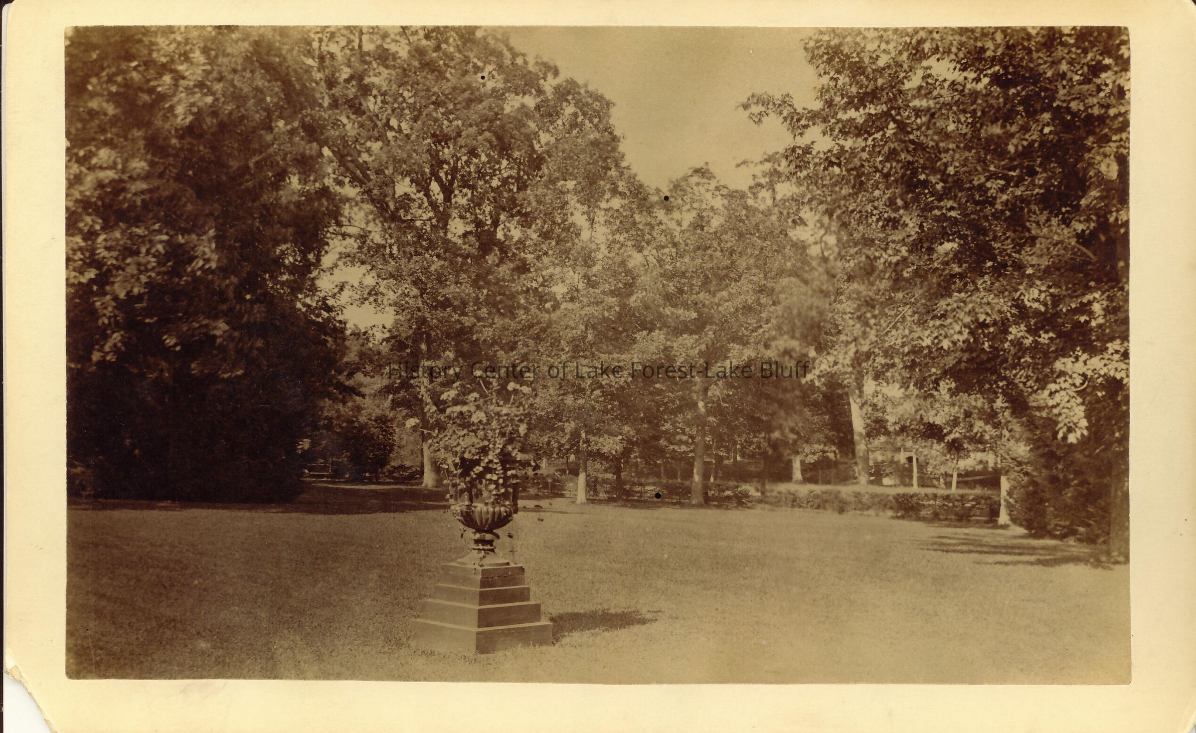 Cabinet card on stiff backing. Holt garden with urn in center of grassy yard. Trees surround lawn. House is barely visible at proper left. The Homestead is at 570 N. Sheridan Road, built circa 1860. Written on back, Ellen Holt and H. Brooks Smith coll.