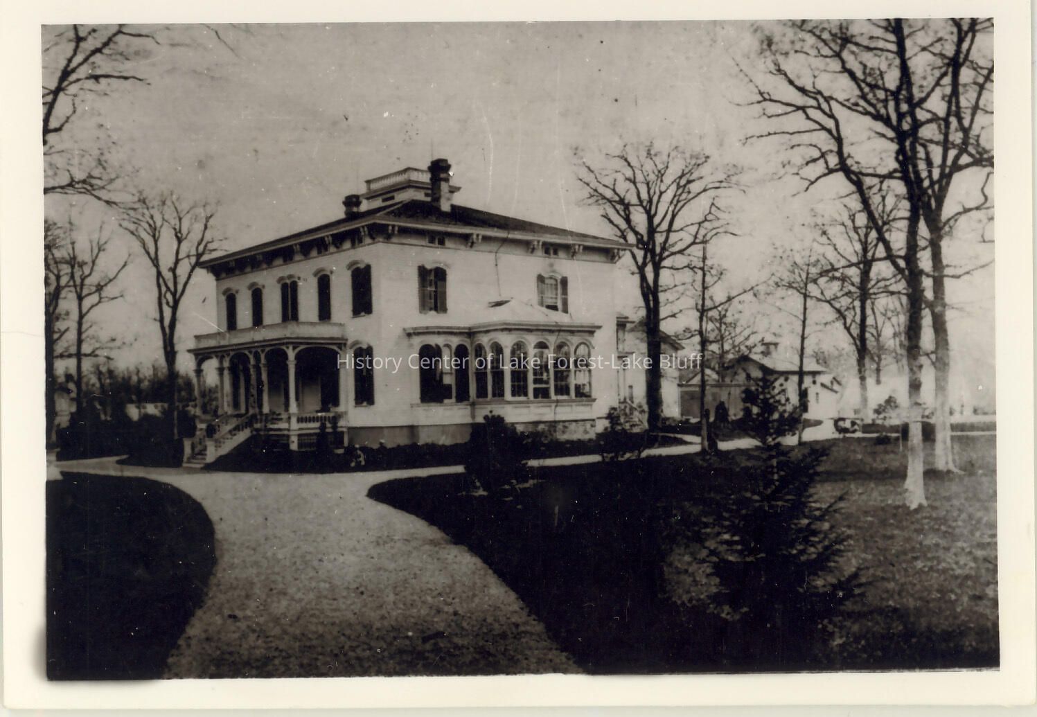 Holt house from the drive of the house. No leaves on trees. Porch and stairs on proper right. The Homestead is at 570 Sheridan Road, built circa 1860. Copy of a copy.