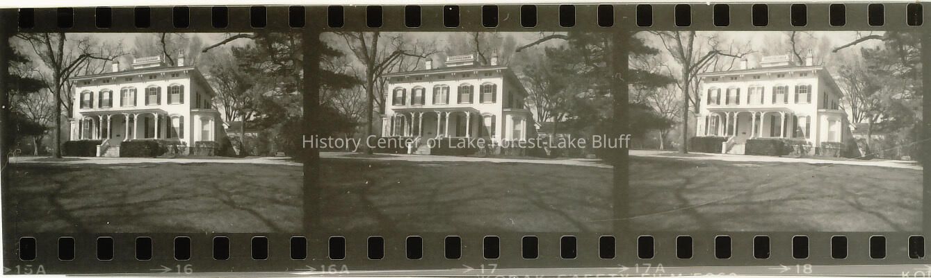 Negative strip of Holt home (The Homestead) from the front. The Homestead is at 570 Sheridan Road circa 1860. Contact sheet has three images on a strip.