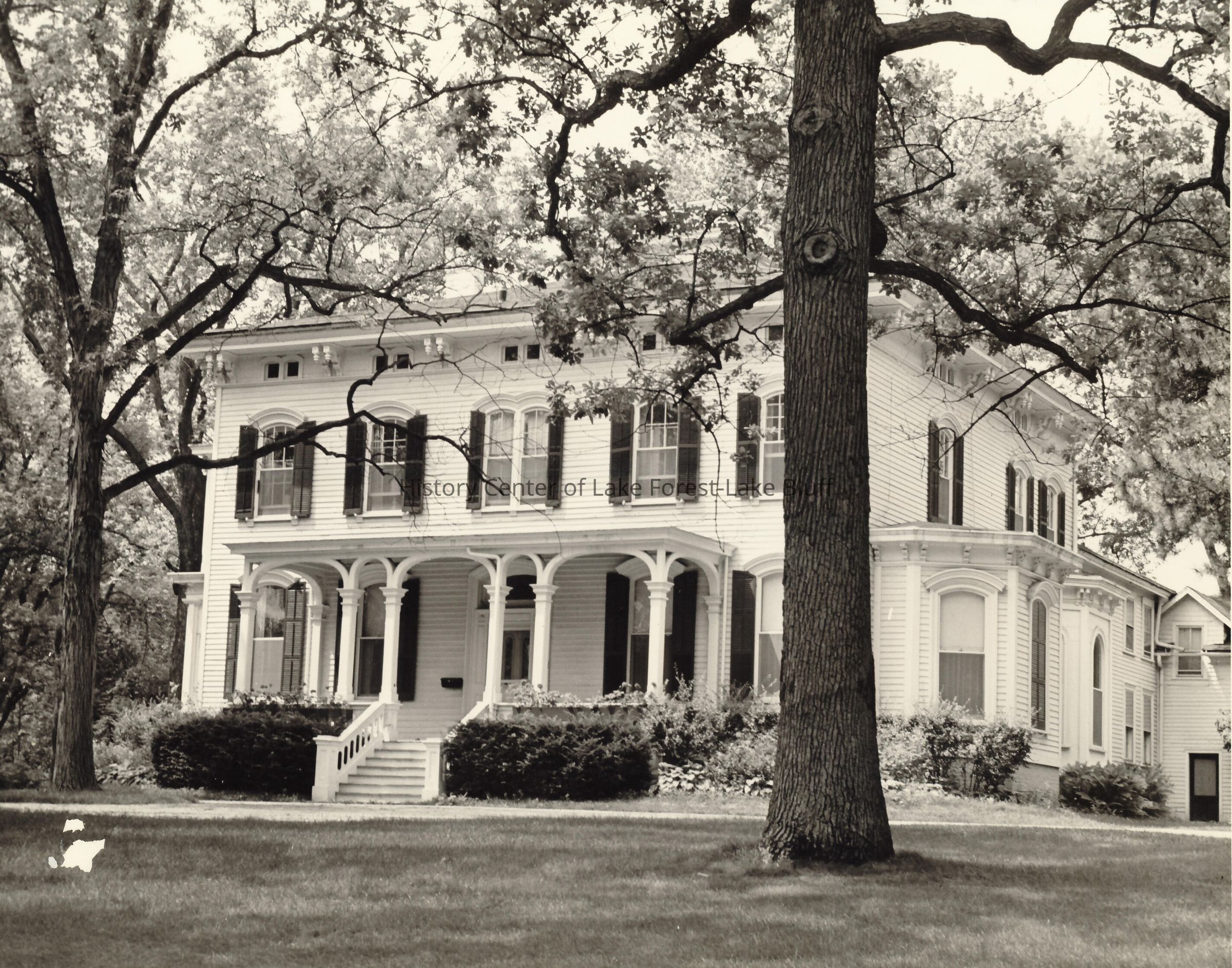 Holt Home (The Homestead) from the front. Trees with leaves surround home. Arched front porch. The Homestead is at 570 Sheridan Road, built circa 1860.