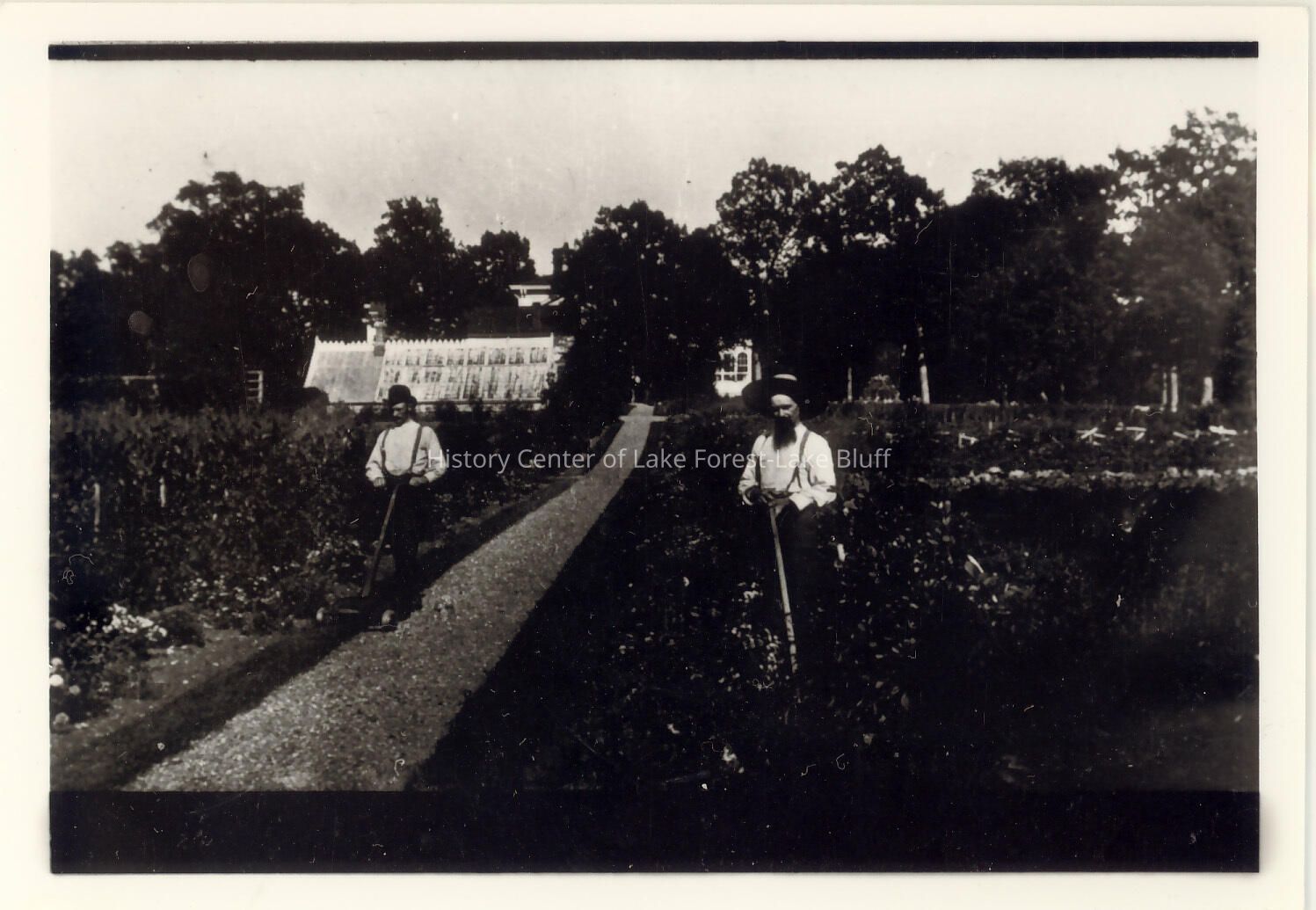 Two gardeners in white shirts with suspenders and hats pose on either side of garden walk, which cuts down center of image. Greenhouse visible at proper right.