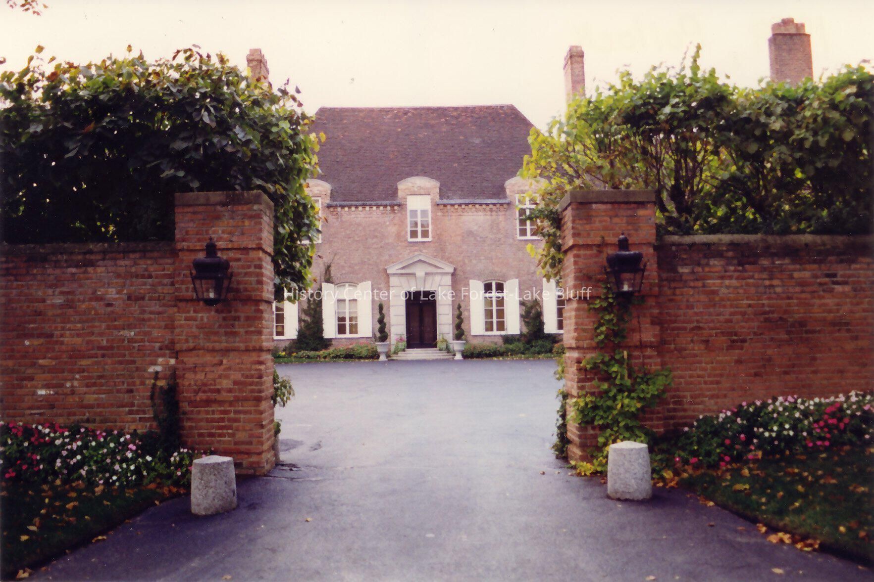 Color photograph of brick residence with high hipped roof, center entrance with limestone pediment, enclosed by rectangular brick walls.