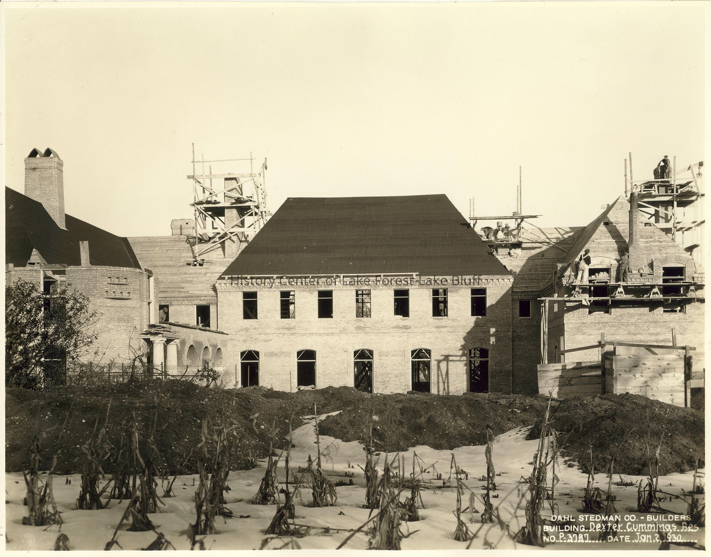 Front view of brick residence with workers on roof and scaffolding around chimneys