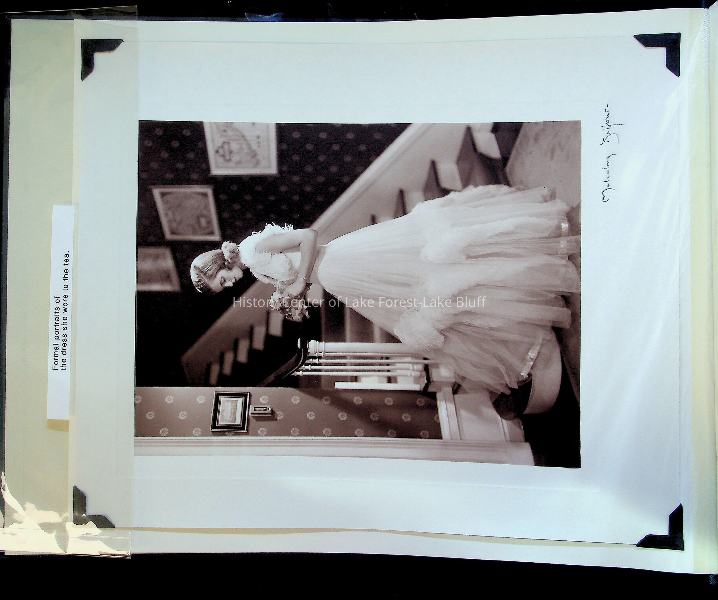 Formal portrait of Helen Dick in the dress she wore at her debut tea.