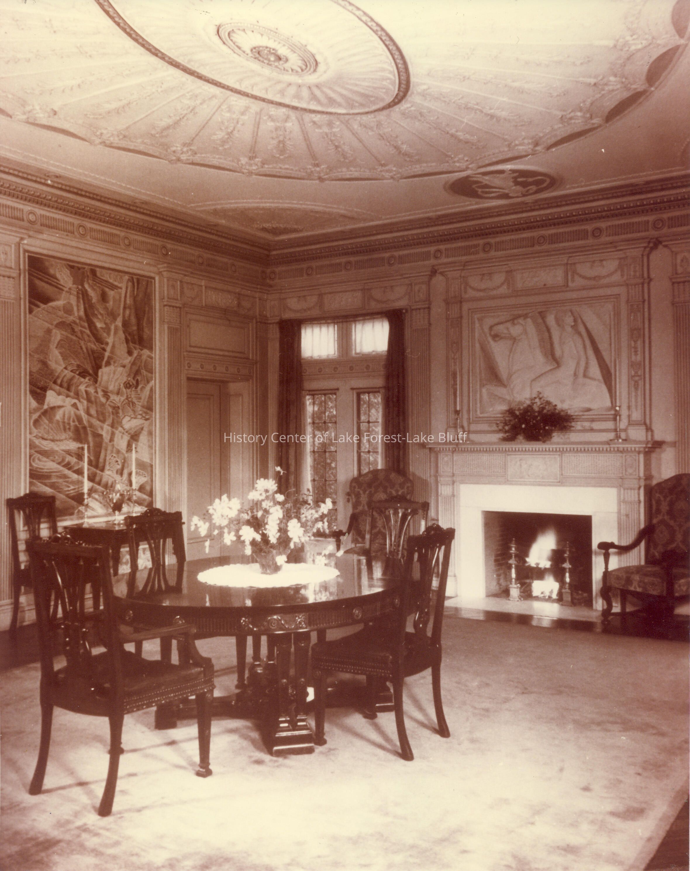Dining room in White Oaks with oval stucco carved ceiling, horse carving above fireplace mantel, and oval dark wood dining table with four chairs