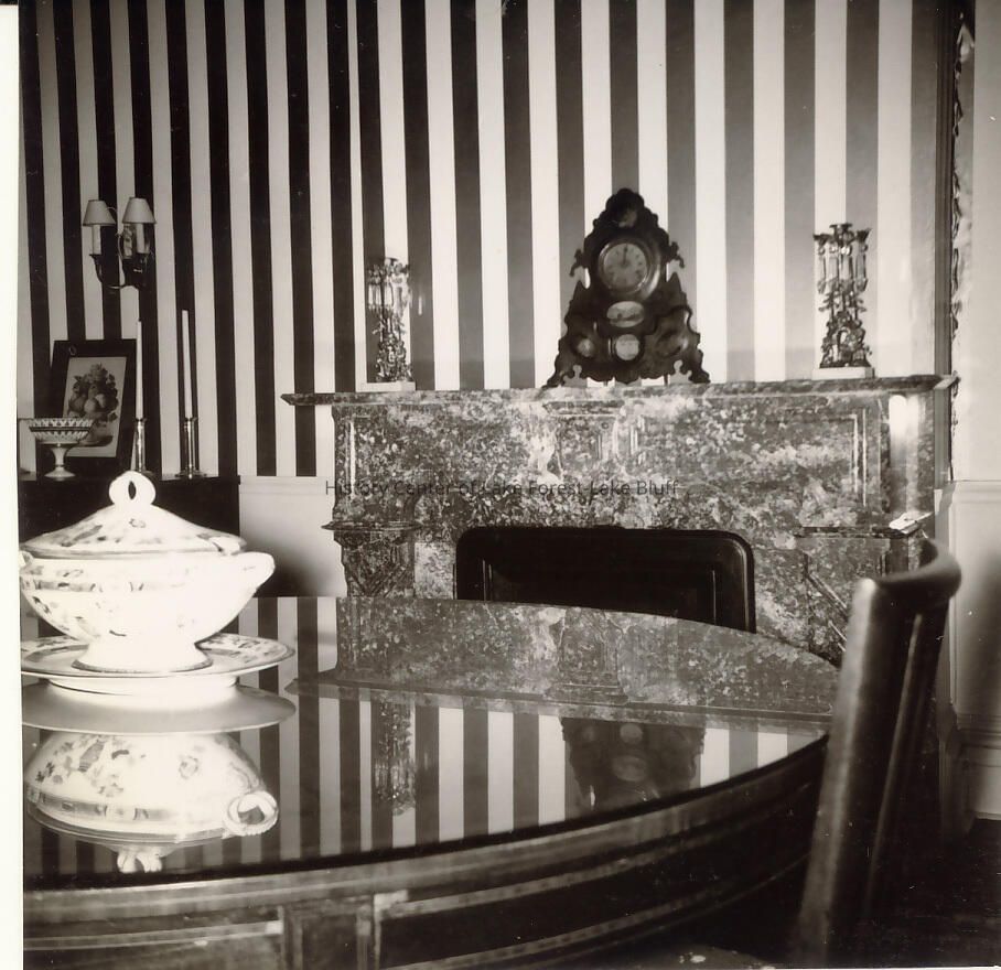 interior image. fireplace with mantel clock, 2 candelabra, brass (?) wall sconce, 2 candlesticks on adjacent cabinet. framed repint resting on cabinet, against wall, filigreed fruit bowl. partially-seen round, glass-topped table and chair. soup tureen and accompanying drip dish on table. dining room?