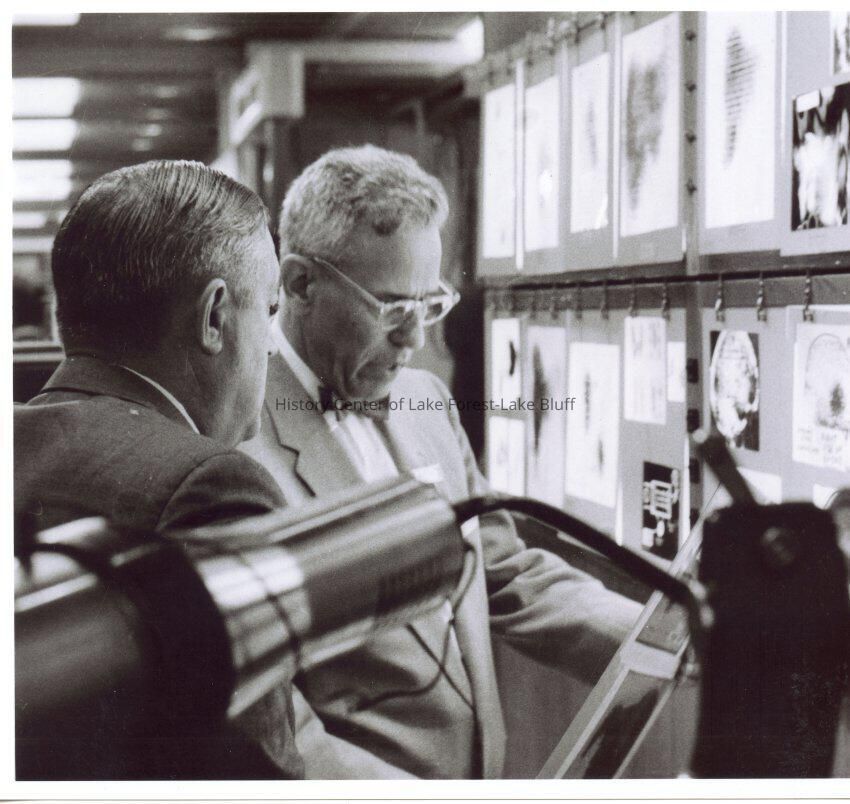 Donalee Tabern and colleague examining radio isotope scans. Donor believes photo was taken in the mid 1960s. Reprinted/reproduction. Black and white.