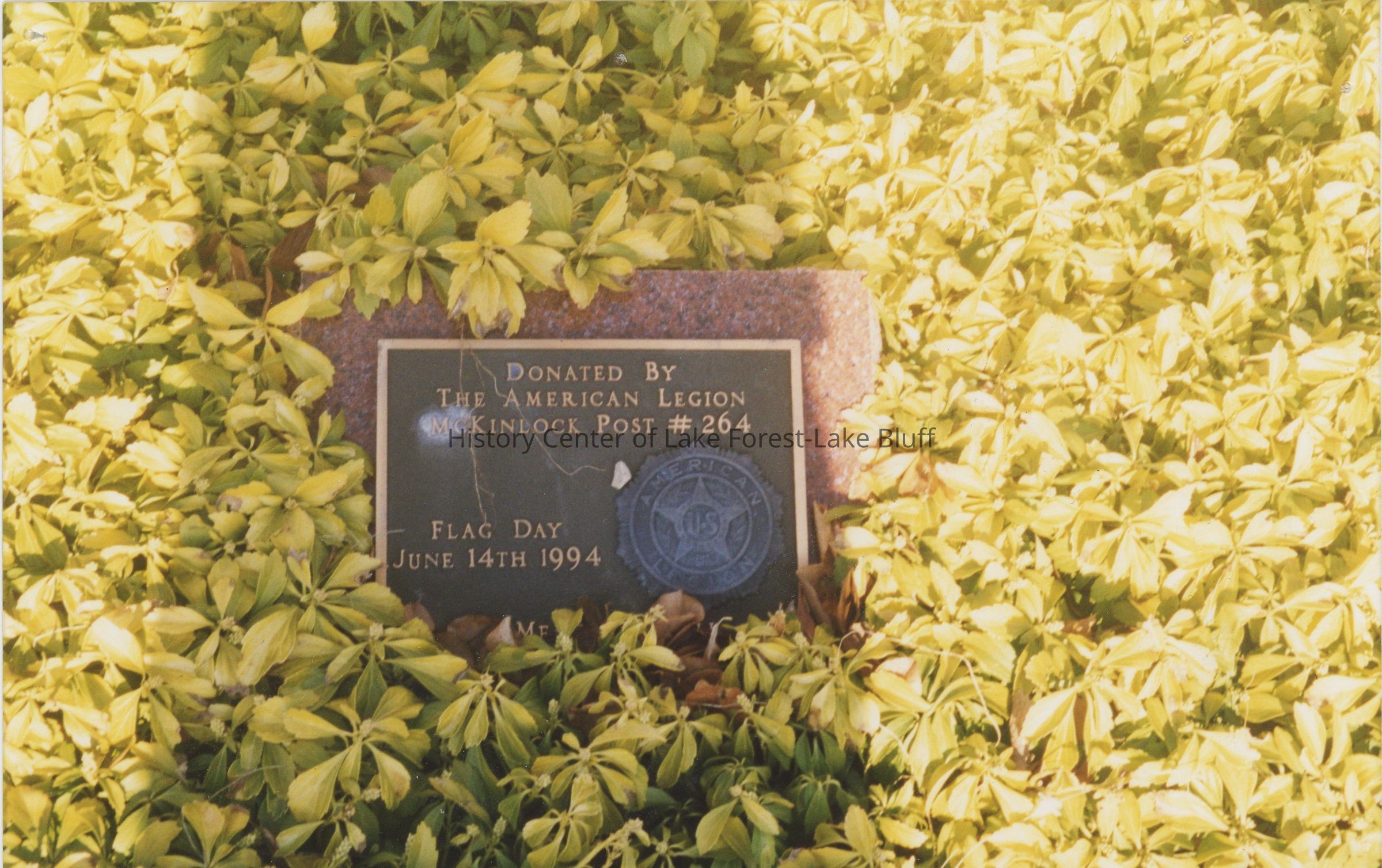 Photograph of a plaque noting a donation by the McKinlock Post 264. Plaque reads "Flag Day June 14th 1994". Memorial Day 2001