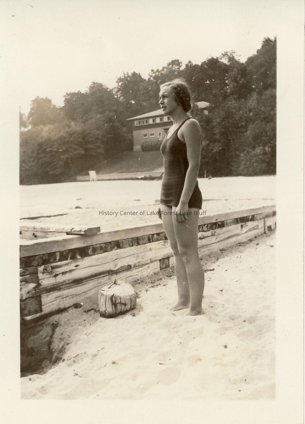 Dorothy Gleiser standing near dock at the Lake Forest beach.
