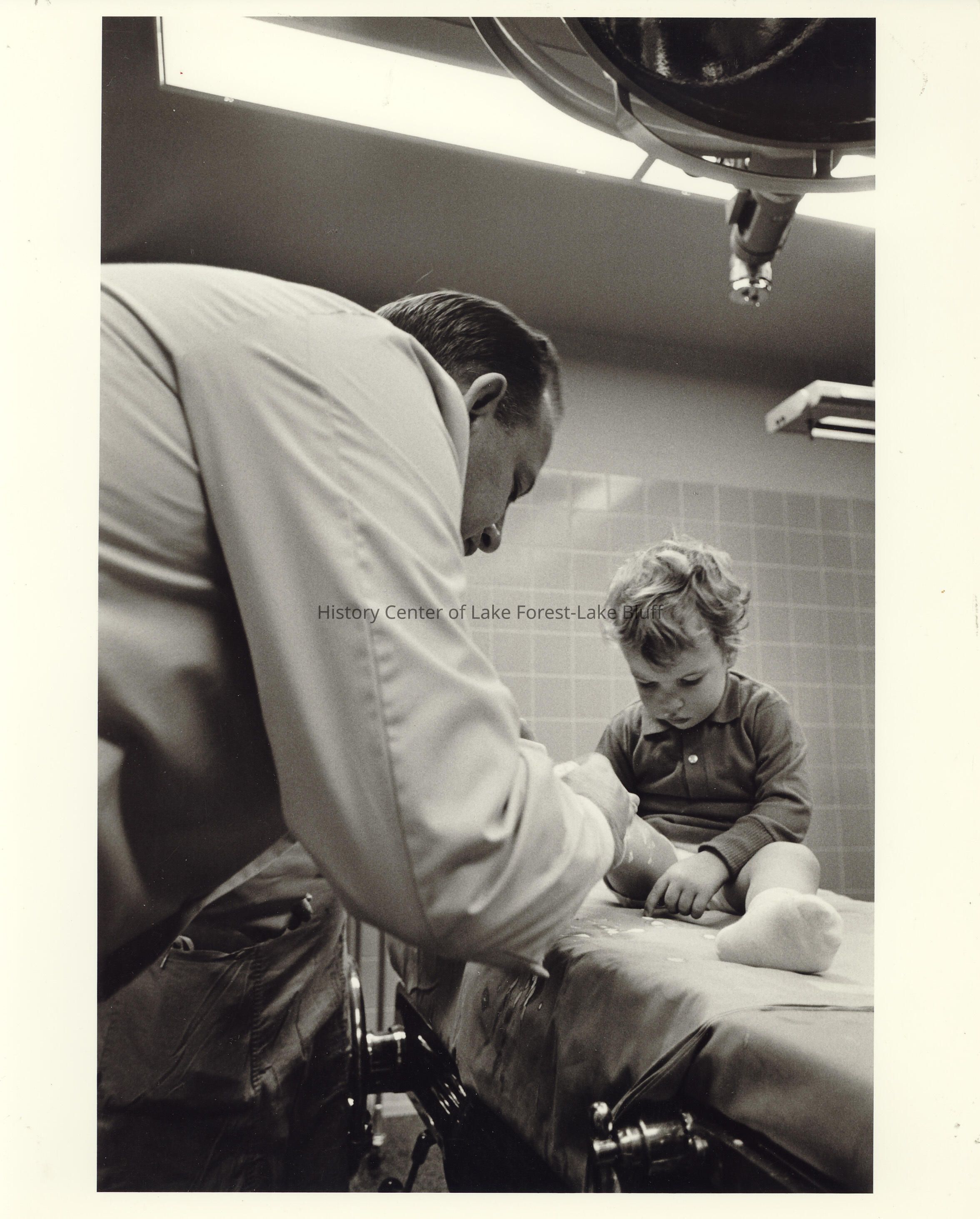 Dr. H Apfelbach examining toddler.Photographs relating to Lake Forest Hospital collected for the 100th Anniversary of the Hospital by the Development Department.