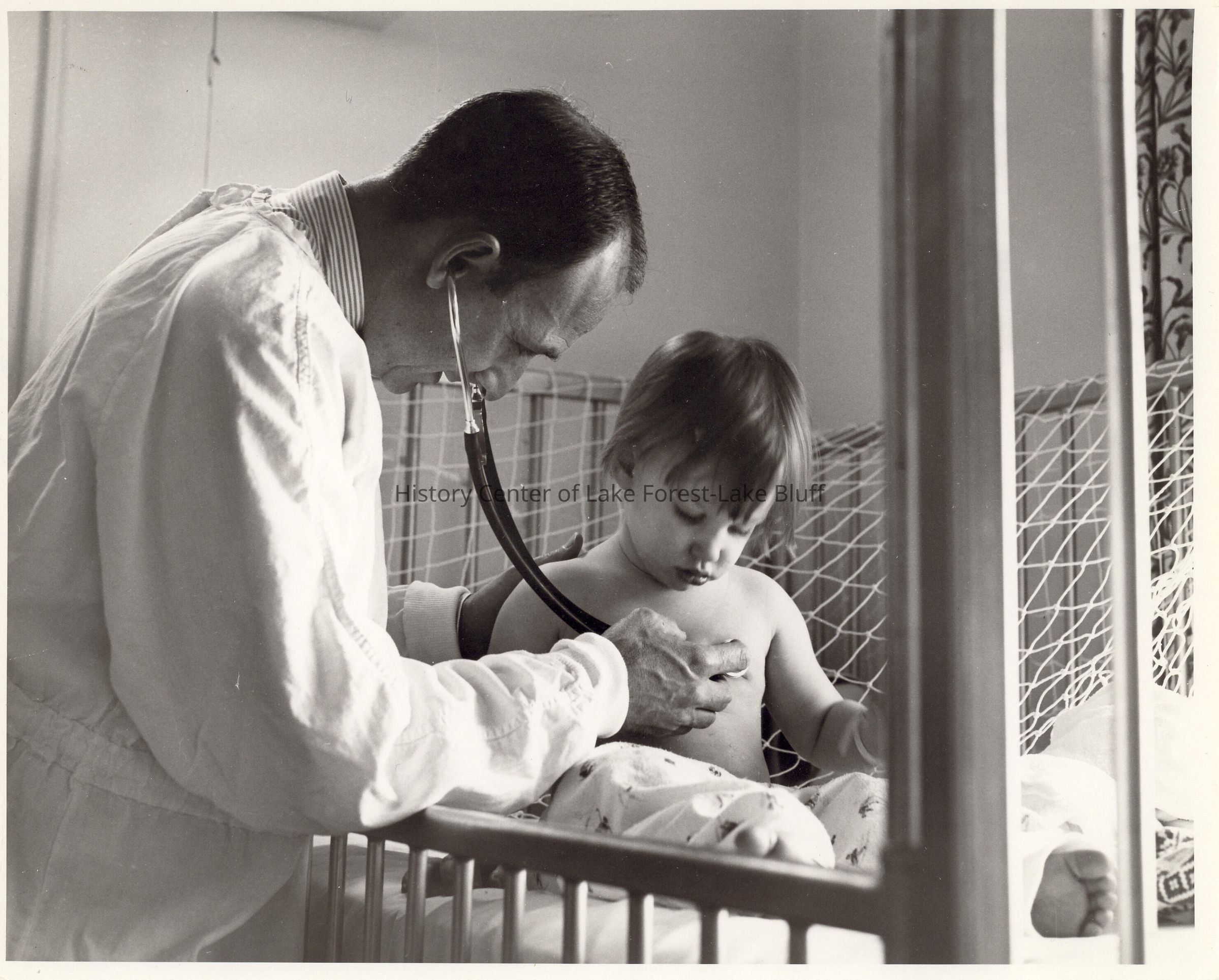 Dr. Elmer Kadison is checking a young patient's heart with a stethoscope. Photographs relating to Lake Forest Hospital collected for the 100th Anniversary of the Hospital by the Development Department.
