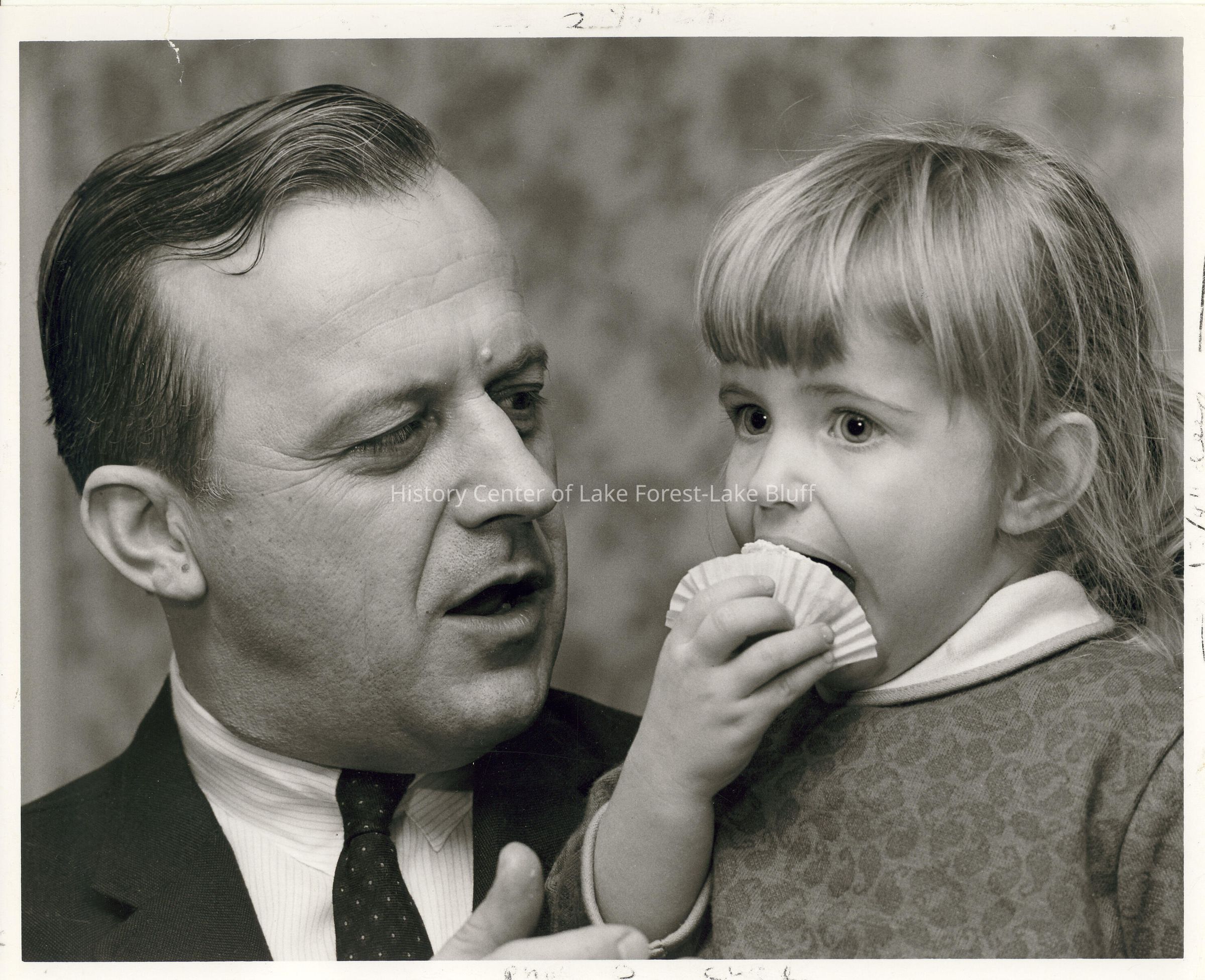 Dr. R. V. Molenda, Veterans Hospital, Downey, IL holding young girl (Deborah Molinda?) The young girl is eating a cupcake as Dr. Molenda looks on. Photographs relating to Lake Forest Hospital collected for the 100th Anniversary of the Hospital by the Development Department.