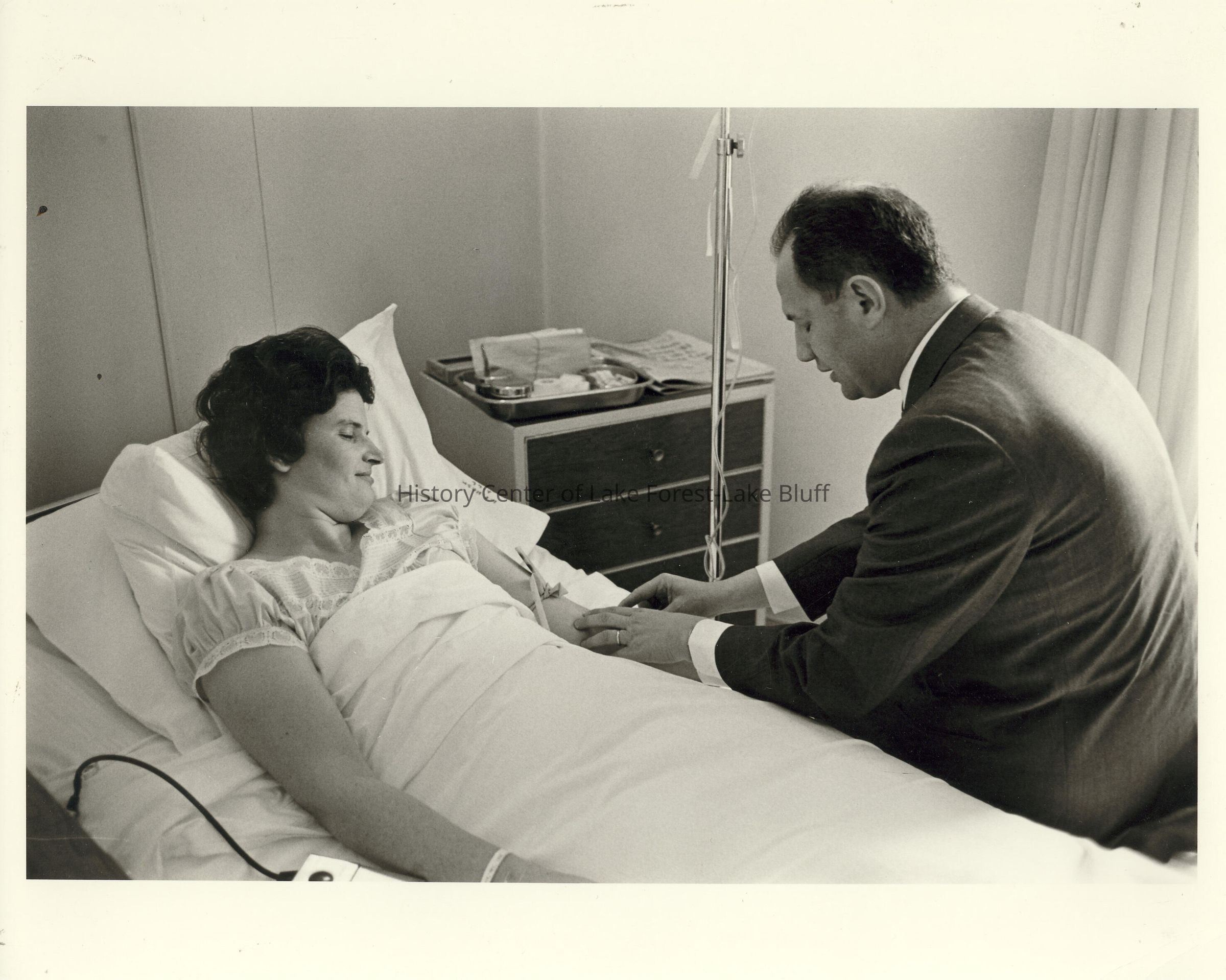 Dr. S. Ninio sitting on bed of woman patient. He is drawing blood from the patient. Photographs relating to Lake Forest Hospital collected for the 100th Anniversary of the Hospital by the Development Department.