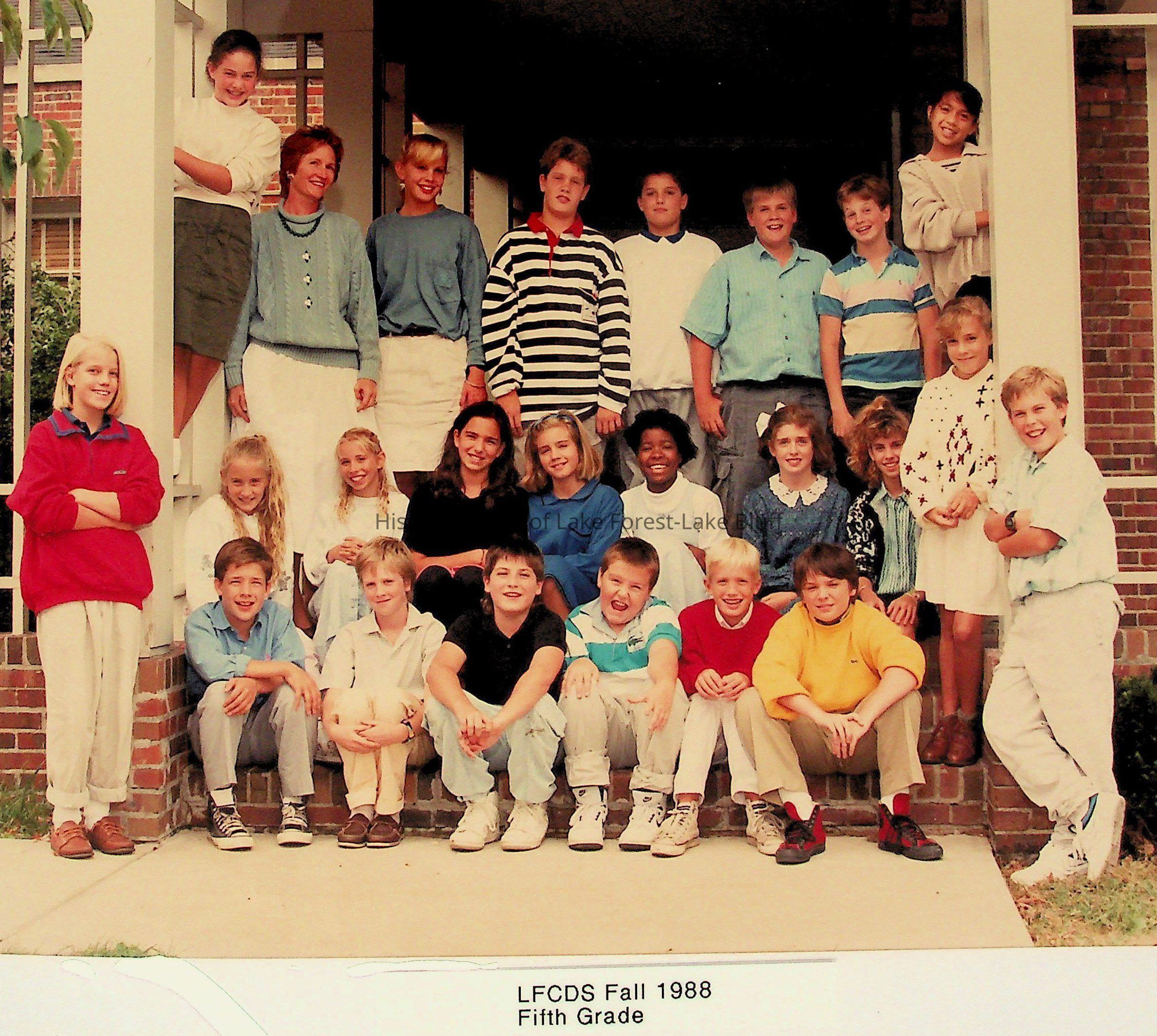 A diverse group of fifth-grade students smiles for a school photo in Fall 1988.