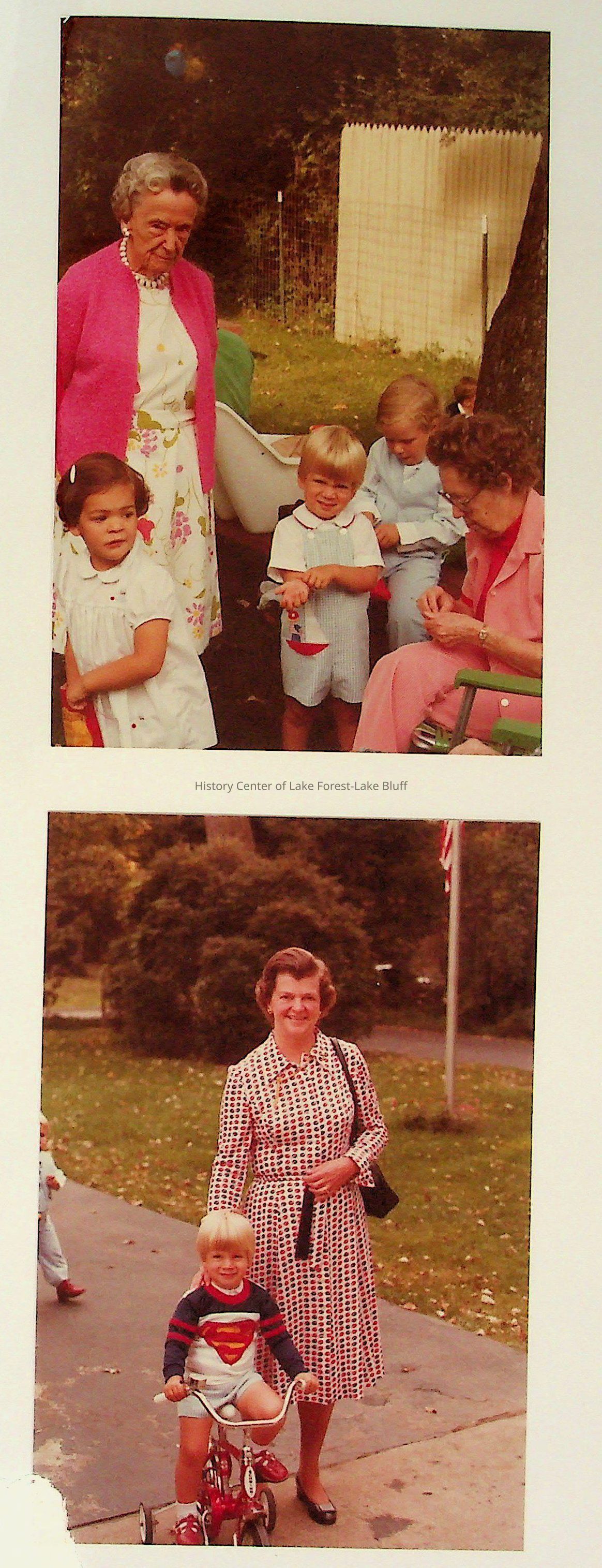 The image shows two distinct scenes captured in outdoor settings featuring elderly women and children enjoying leisurely activities together.