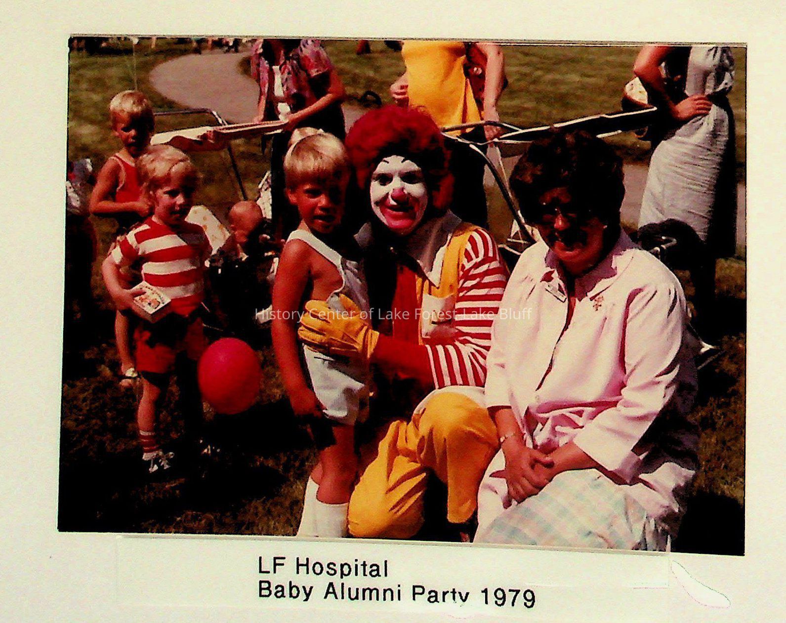 This vintage image shows people at a Baby Alumni Party in 1979, featuring children and a clown