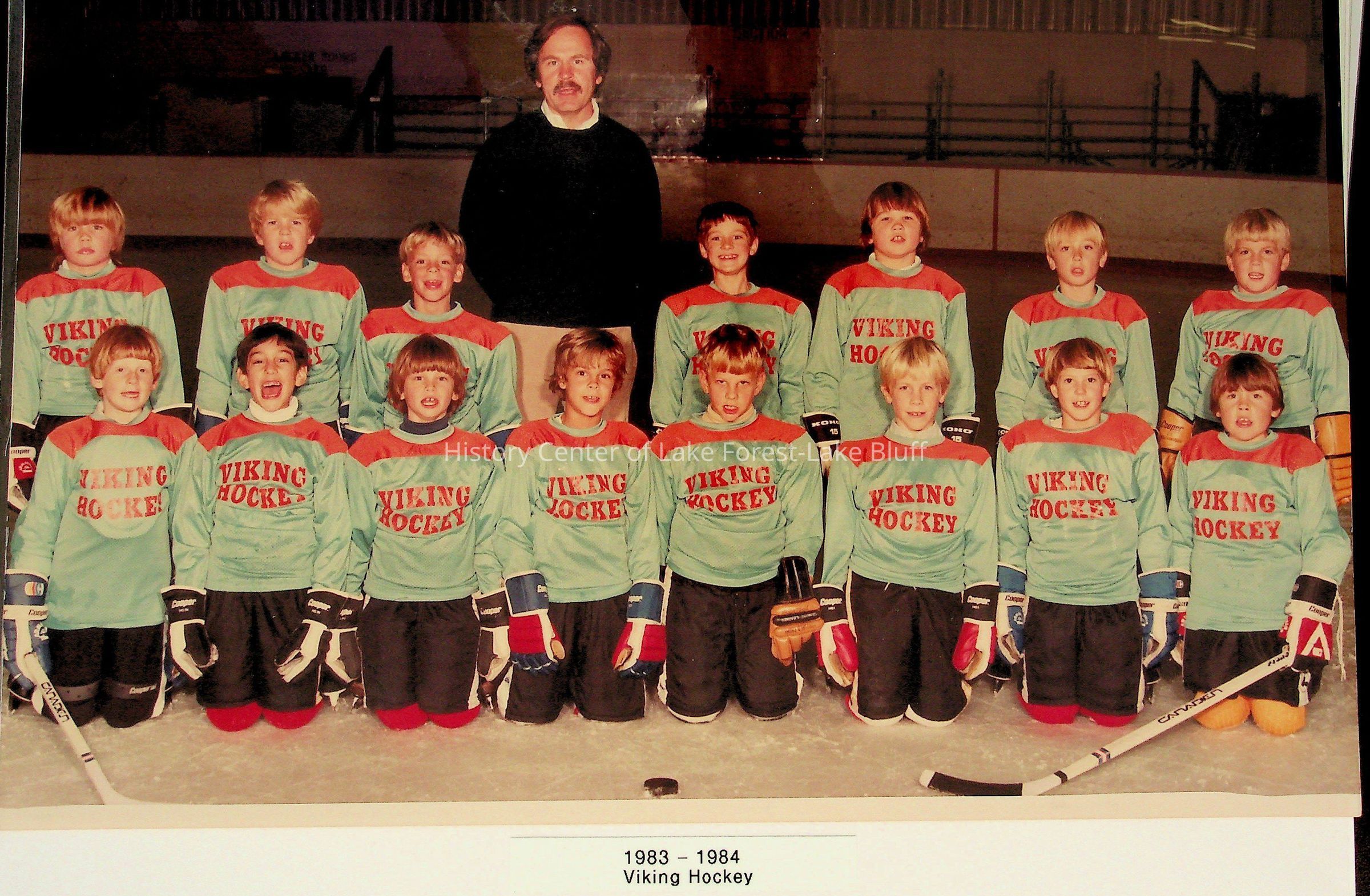 A youth ice hockey team poses with their coach in matching teal and red uniforms.
