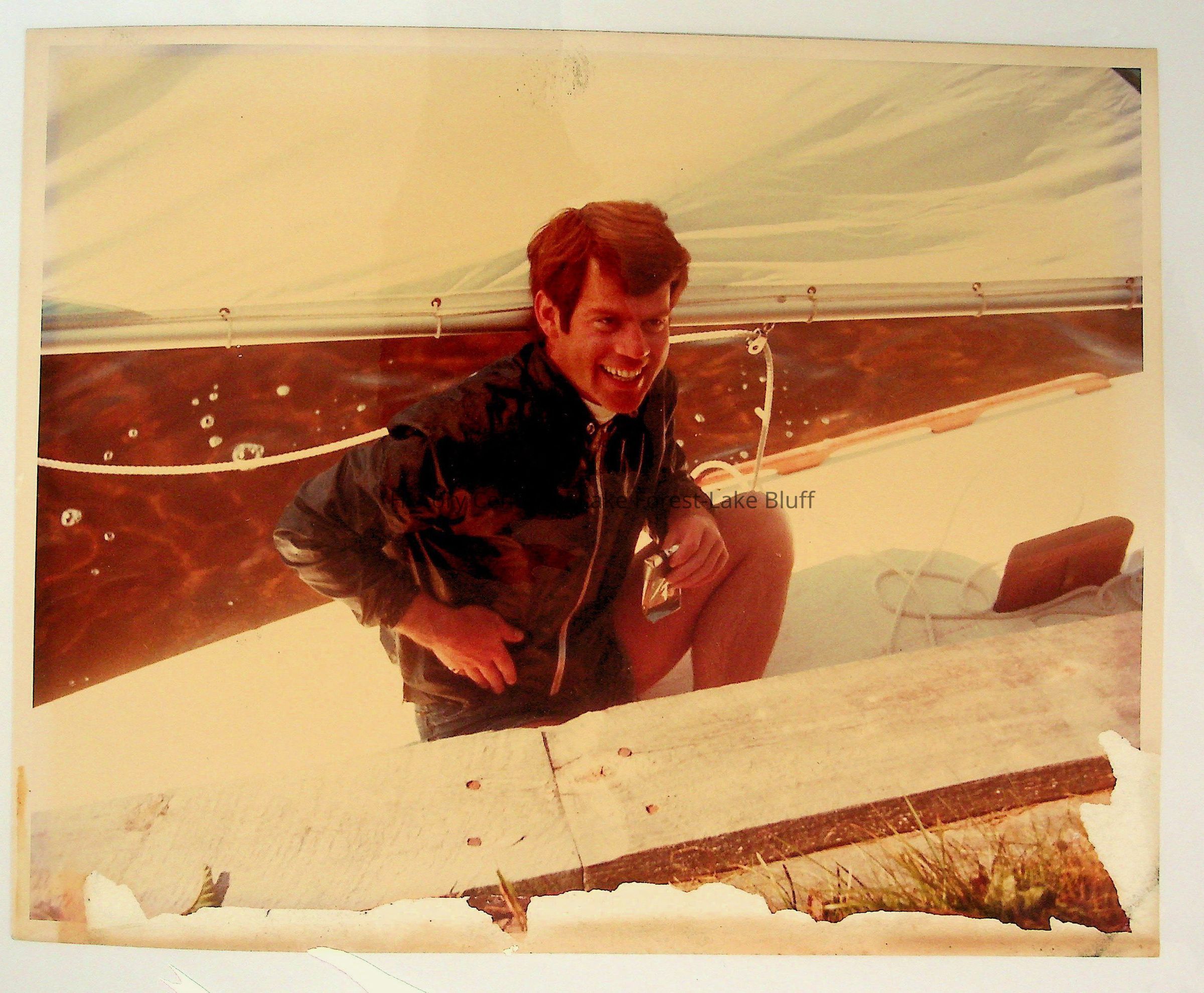 A man smiles while crouching on snow-covered ground beneath a tarp.