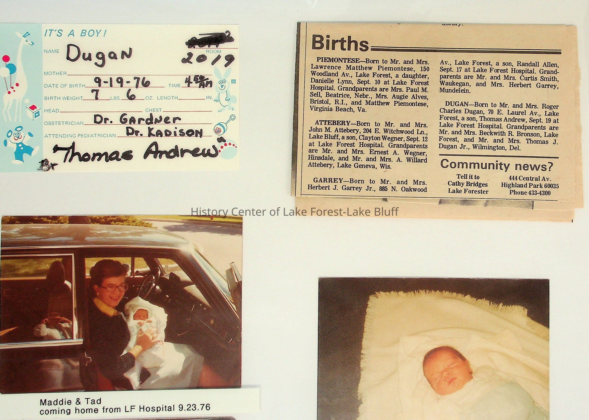 The image displays various birth announcements, newspaper clippings, and a photograph of a woman holding a baby.