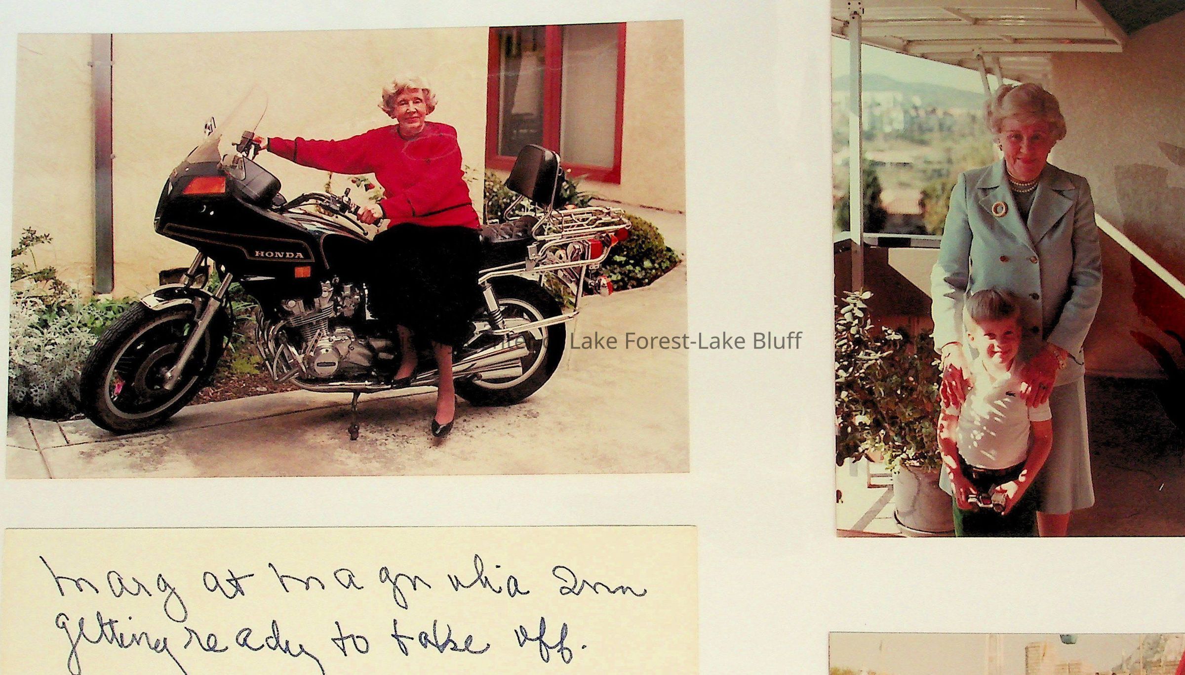 The image displays two photos of an elderly woman, one posing on a motorcycle and another standing with a young boy.