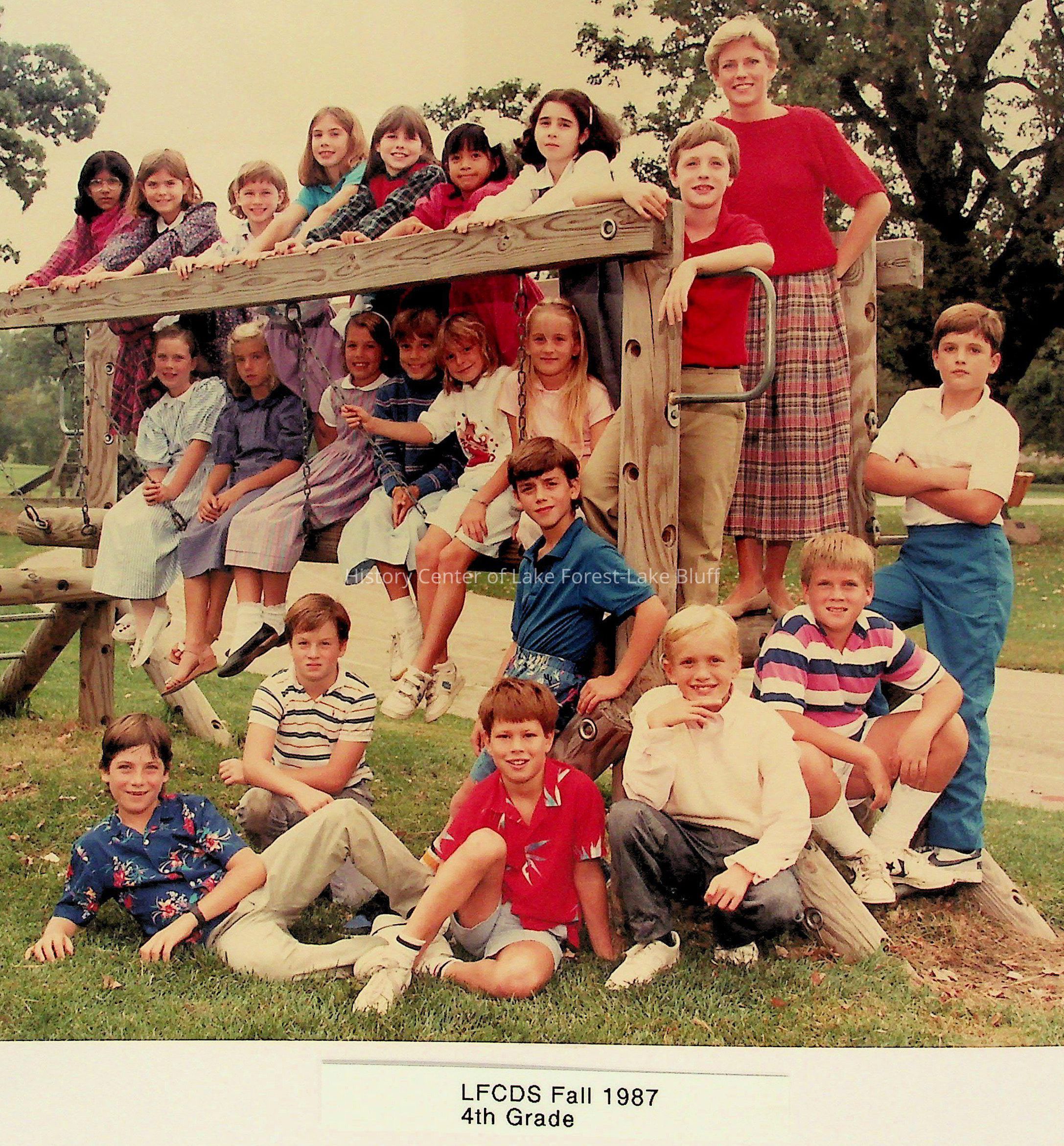 The image shows a group of fourth-grade students posing for a class photo on an outdoor playground structure.