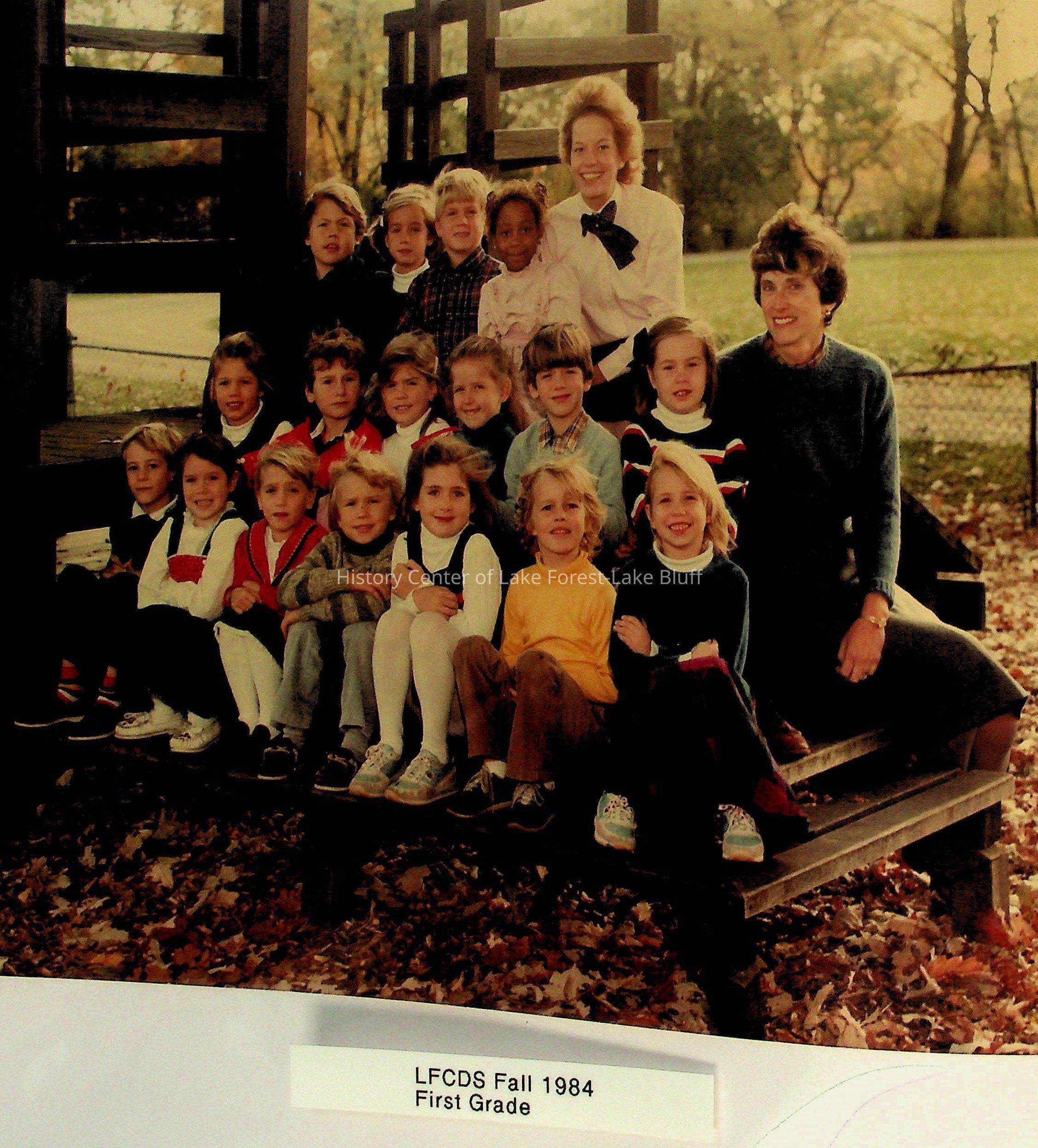 A group of smiling first-grade students and two teachers pose outdoors in autumn 1984.