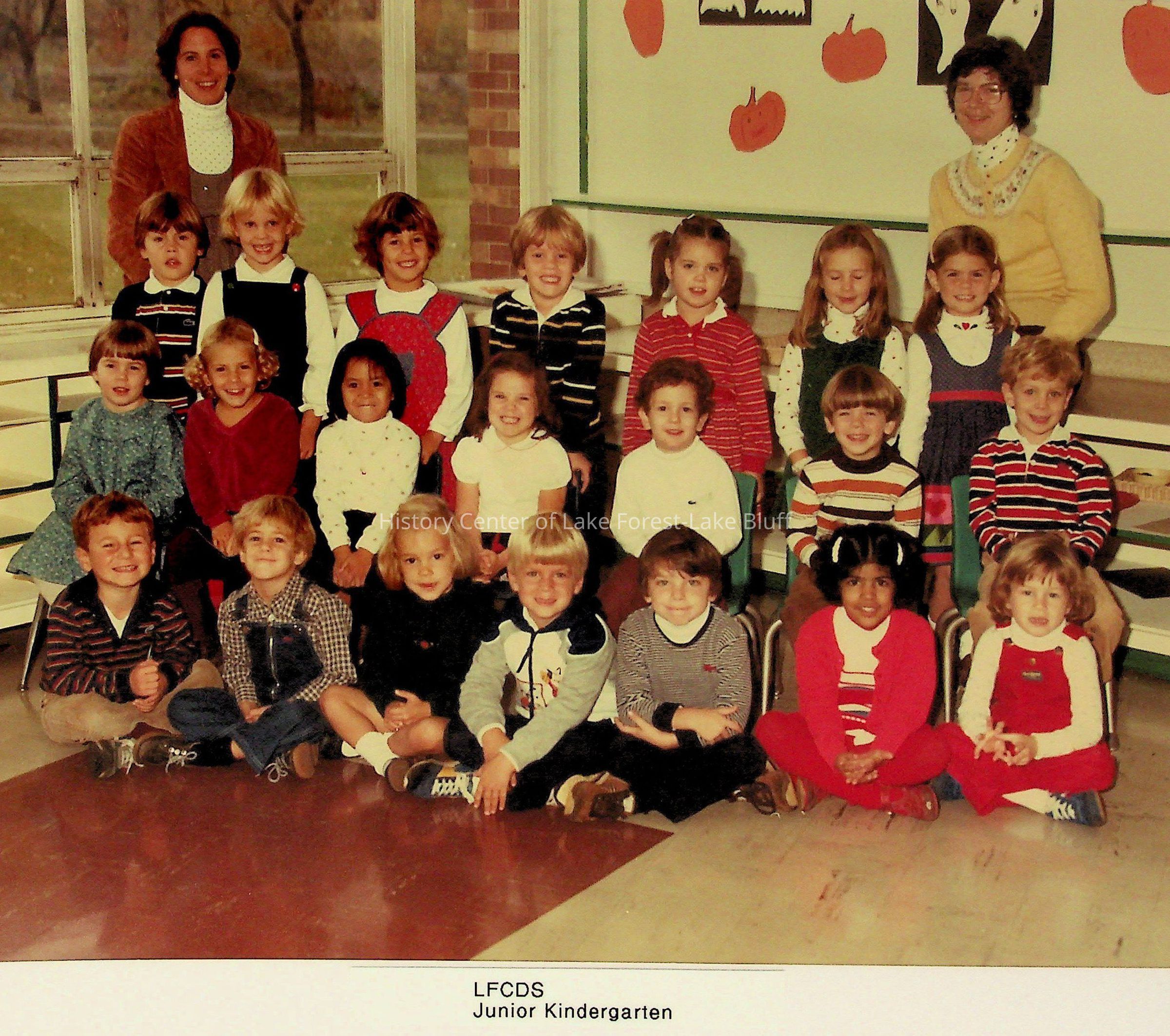A group of kindergarteners and two teachers pose in a cheerful classroom decorated with pumpkin drawings.