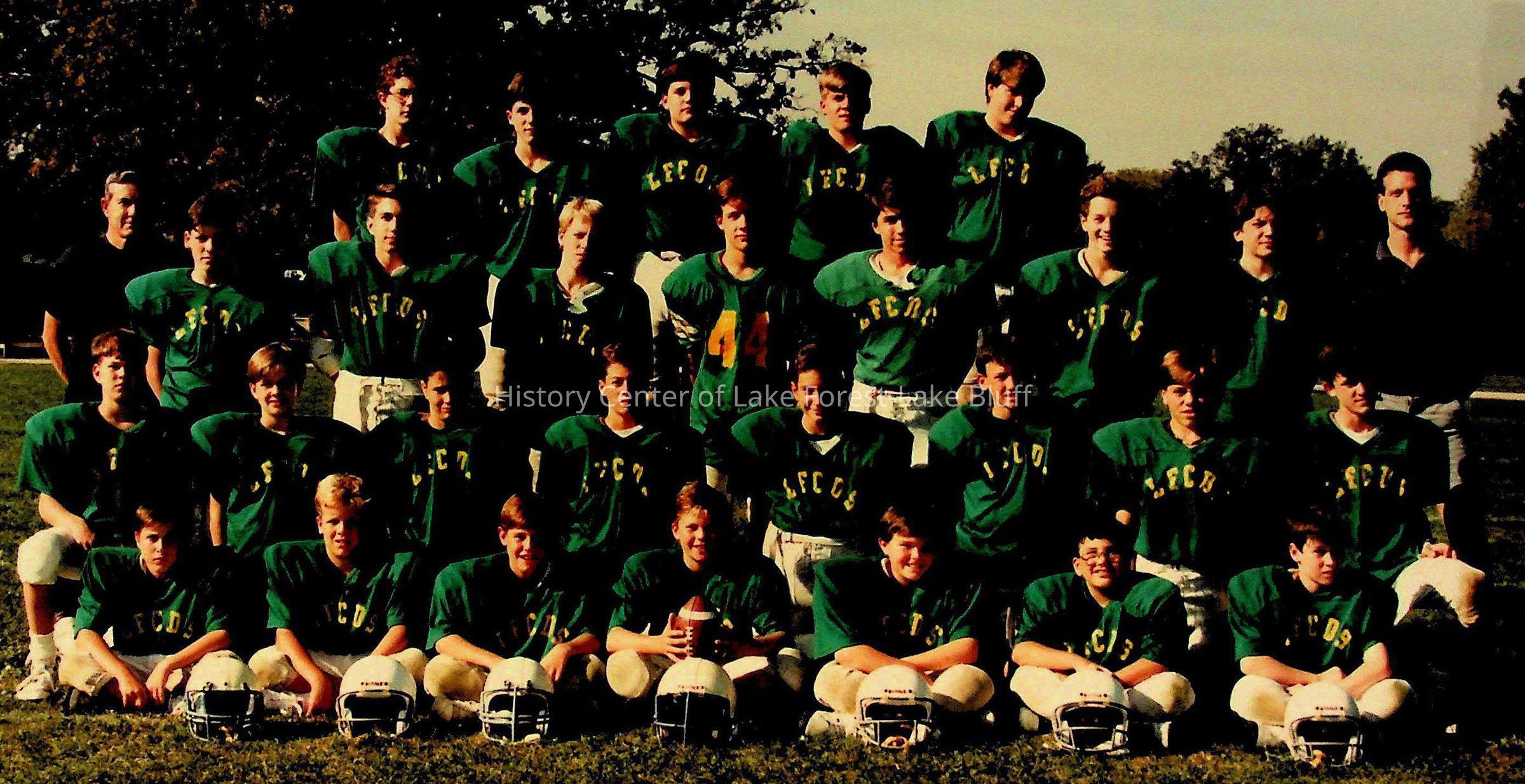 The image shows a group of young male athletes in green uniforms, posing for a team photo on a grass field.