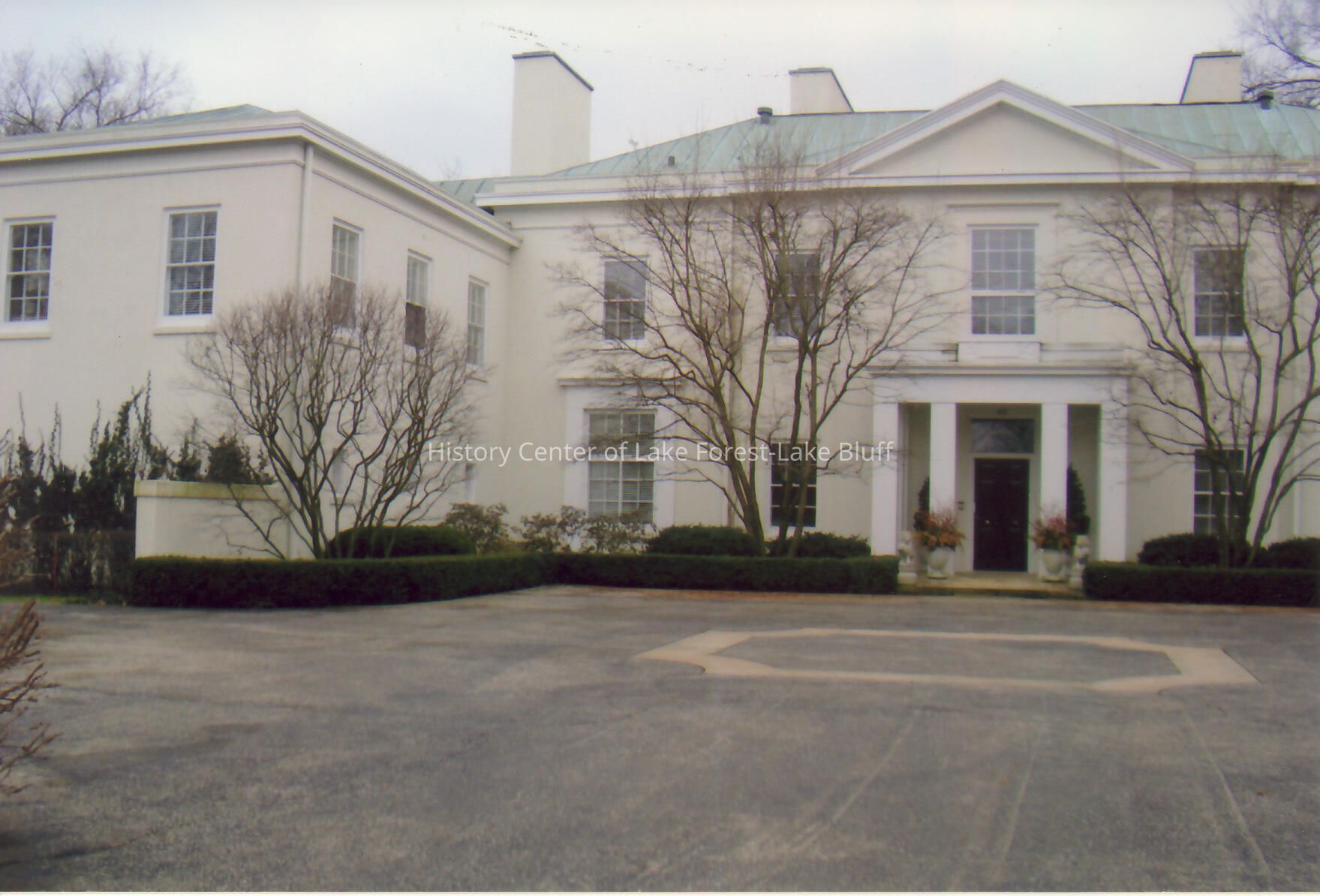 Exterior view from drive way of Walter Frazier home built for Duncan and Sarah Hodges in 1930. Located at 85 E. Westminster in Lake Forest, Illinois.