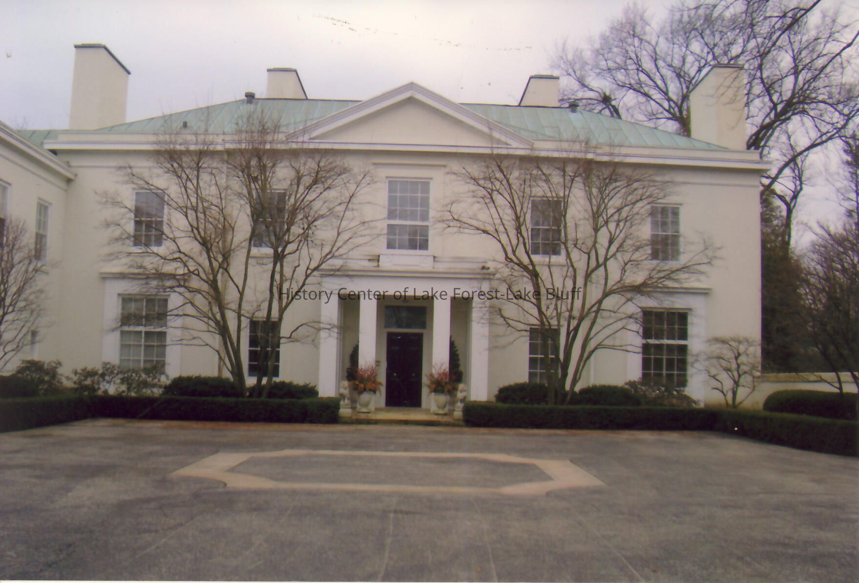 Exterior view from drive way of Walter Frazier home built for Duncan and Sarah Hodges in 1930. Located at 85 E. Westminster in Lake Forest, Illinois.