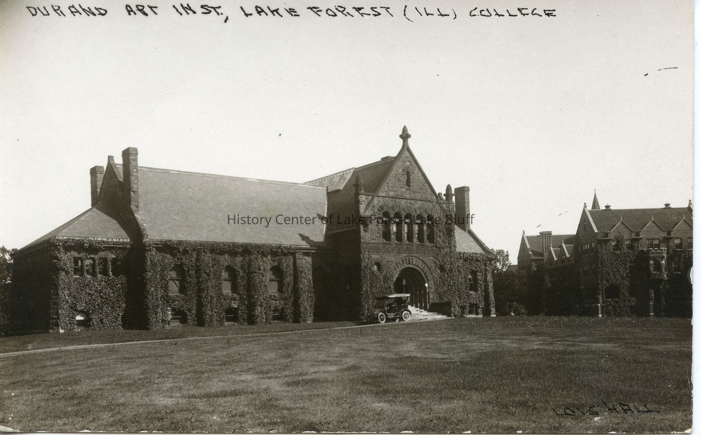 Postcard of Durand Art Institute, Lake Forest College. To the right part of Lois Durand Hall can be seen. 1910s.