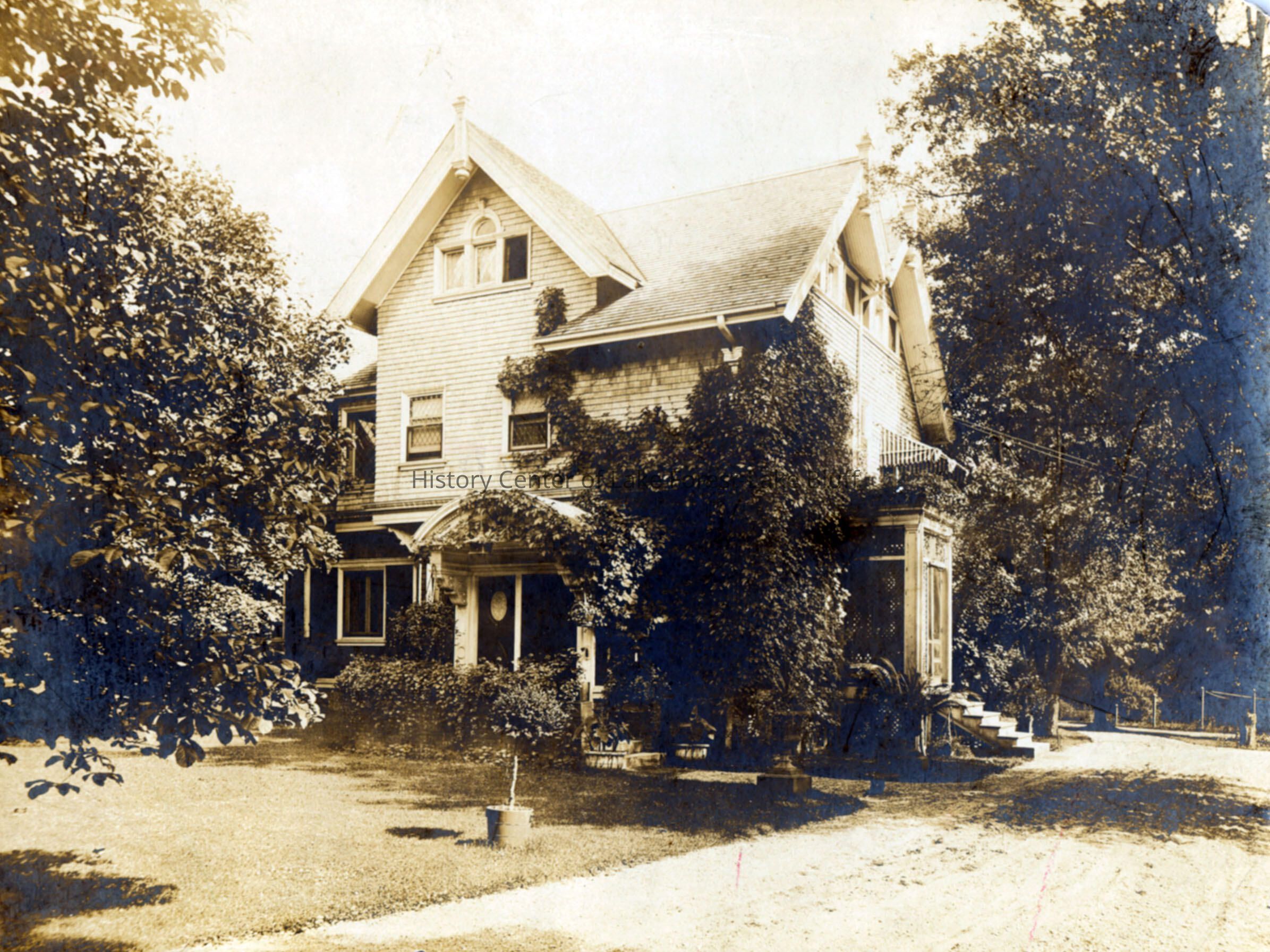 Black and white sepia toned photograph of the original Durand house, 1898-1905 "Front of House" Photograph is mounted on forest green card board, which is severely torn.