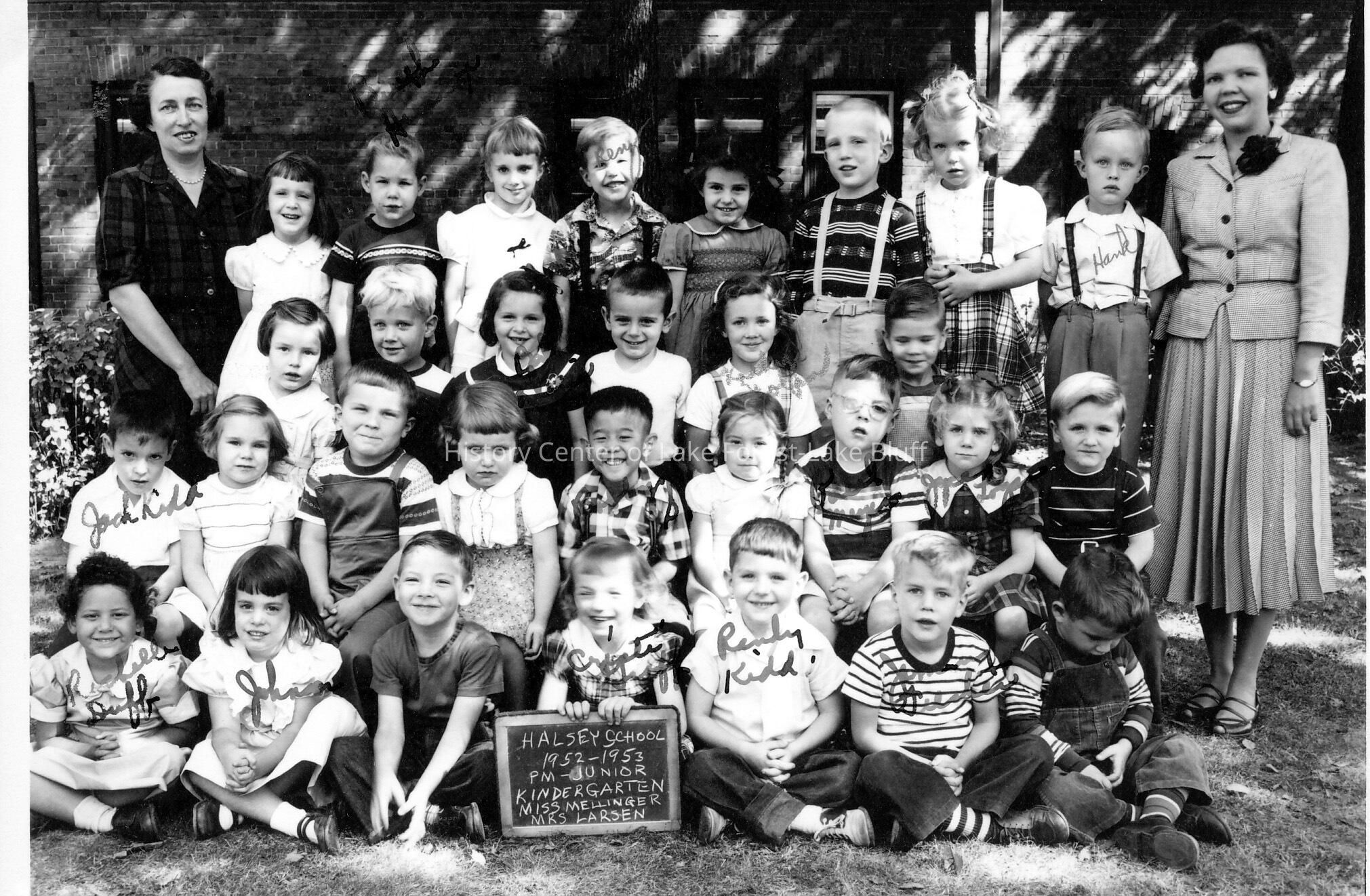Halsey School, 1952-1953, PM Junior Kindergarten, Miss Mellinger and Mrs. Larsen, teachers Jack Kidd, Randy Kidd, Paul Meyers, Joyce Logan