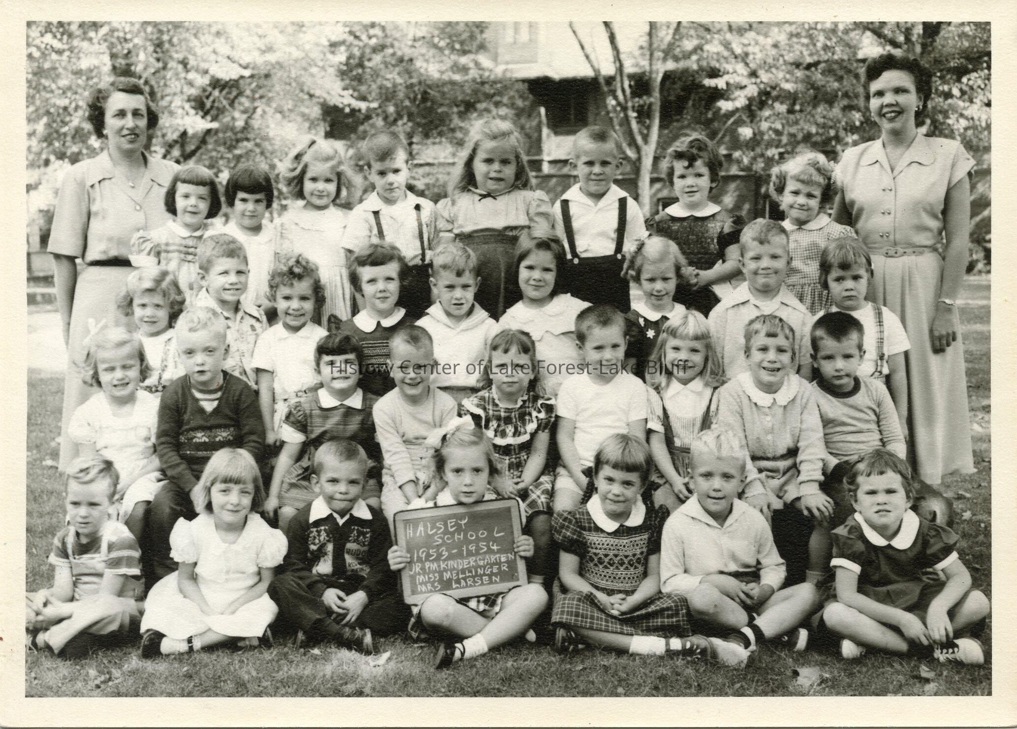 1953-1954 Halsey School, Jr. PM Kindergarten, teachers Miss Mellinger (right) and Mrs. Larsen (left).