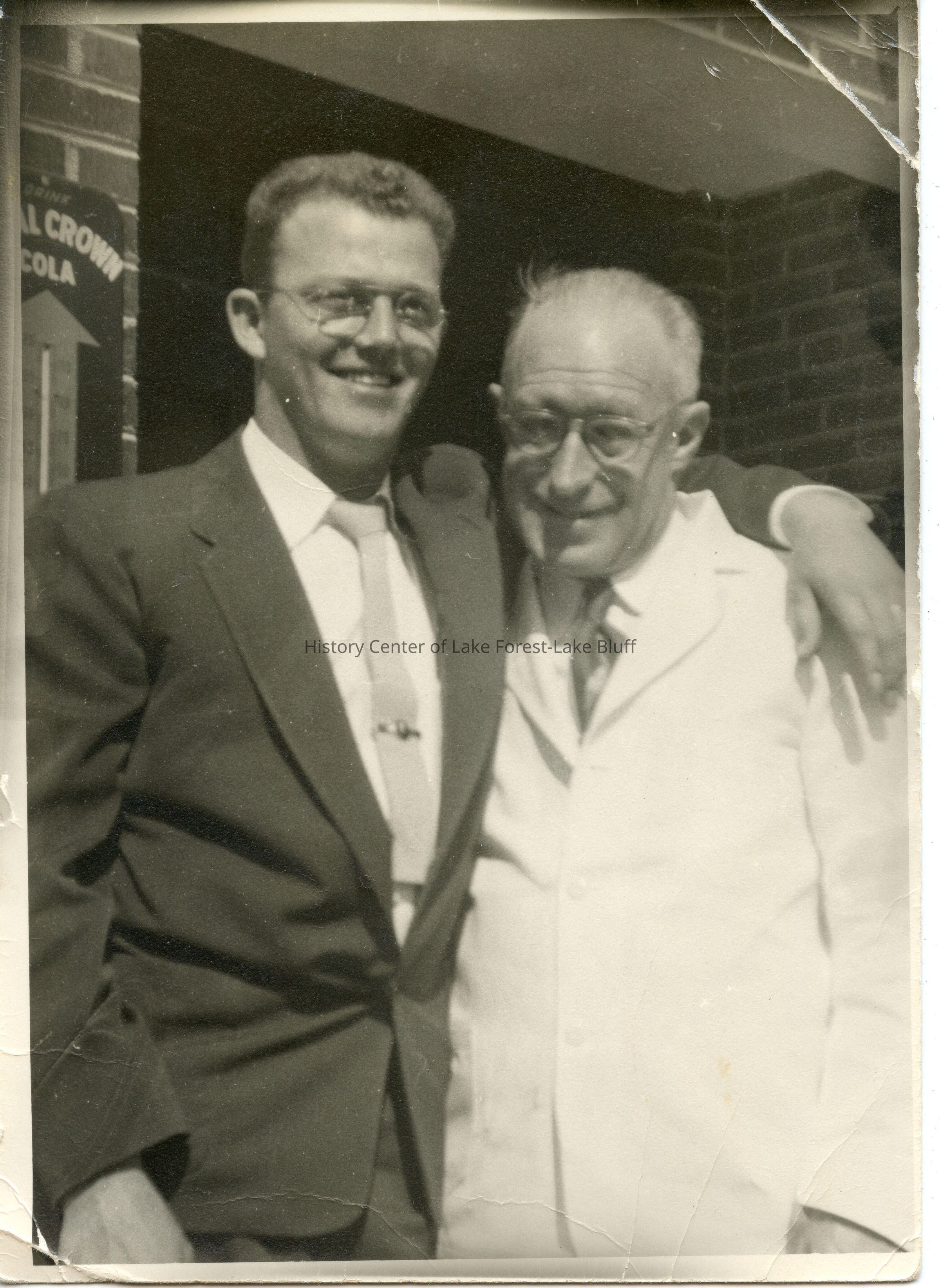 Black and white photograph. 5"x7". Robert A. Knigge on left in suit and tie. Earl J. Greene on right in long white coat. Standing in front of a brick building. Thermometer advertising Royal Crown Cola visible on wall. Robert A. Knigge was married to Kathryn Greene, Earl's daughter.