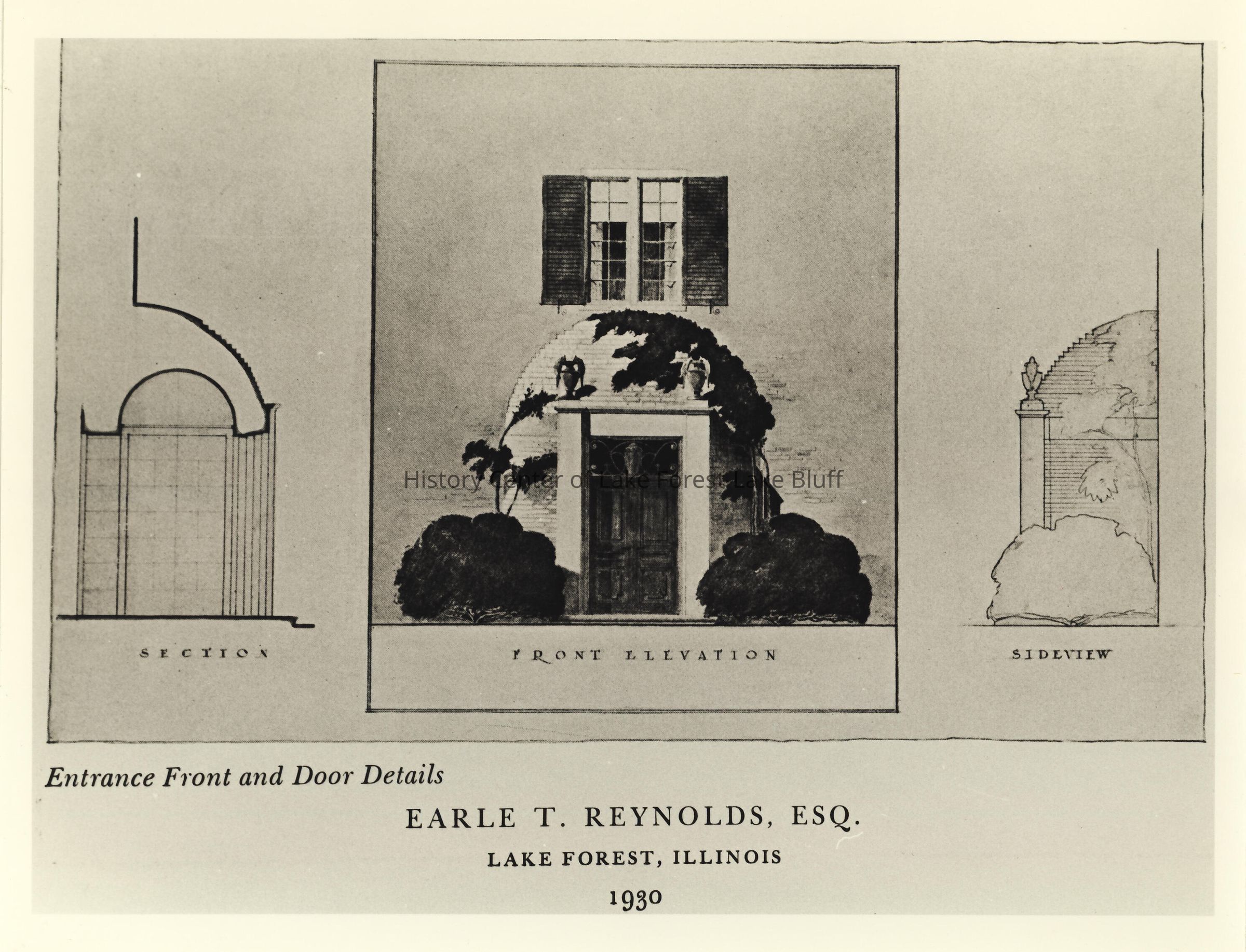 Earle T. Reynolds Estate entrance front and door details from a book of architecture of Harrie T. Lindeberg 430 N. Green Bay Road Lindeberg, Harrie T. (architect) 1930