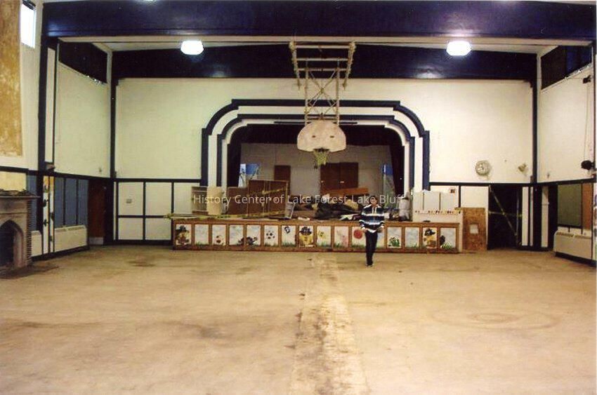 Photograph of East School in Lake Bluff prior to 2011 teardown. Gym, with stage; fireplace on left (east side). Dated April 11, 2011. East School was located at Sheridan Place and Vincent Court. It first opened in 1895, with major renovations in 1923, 1946, 1950, and 1958.Made/Created