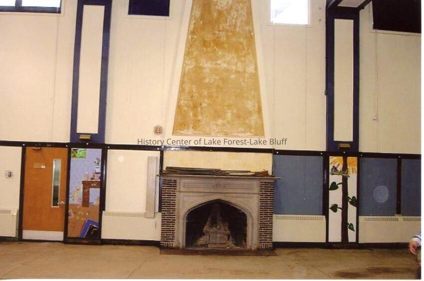 Photograph of East School in Lake Bluff prior to 2011 teardown. Interior - fireplace in gym, east side. Dated April 11, 2011. East School was located at Sheridan Place and Vincent Court. It first opened in 1895, with major renovations in 1923, 1946, 1950, and 1958.Made/Created