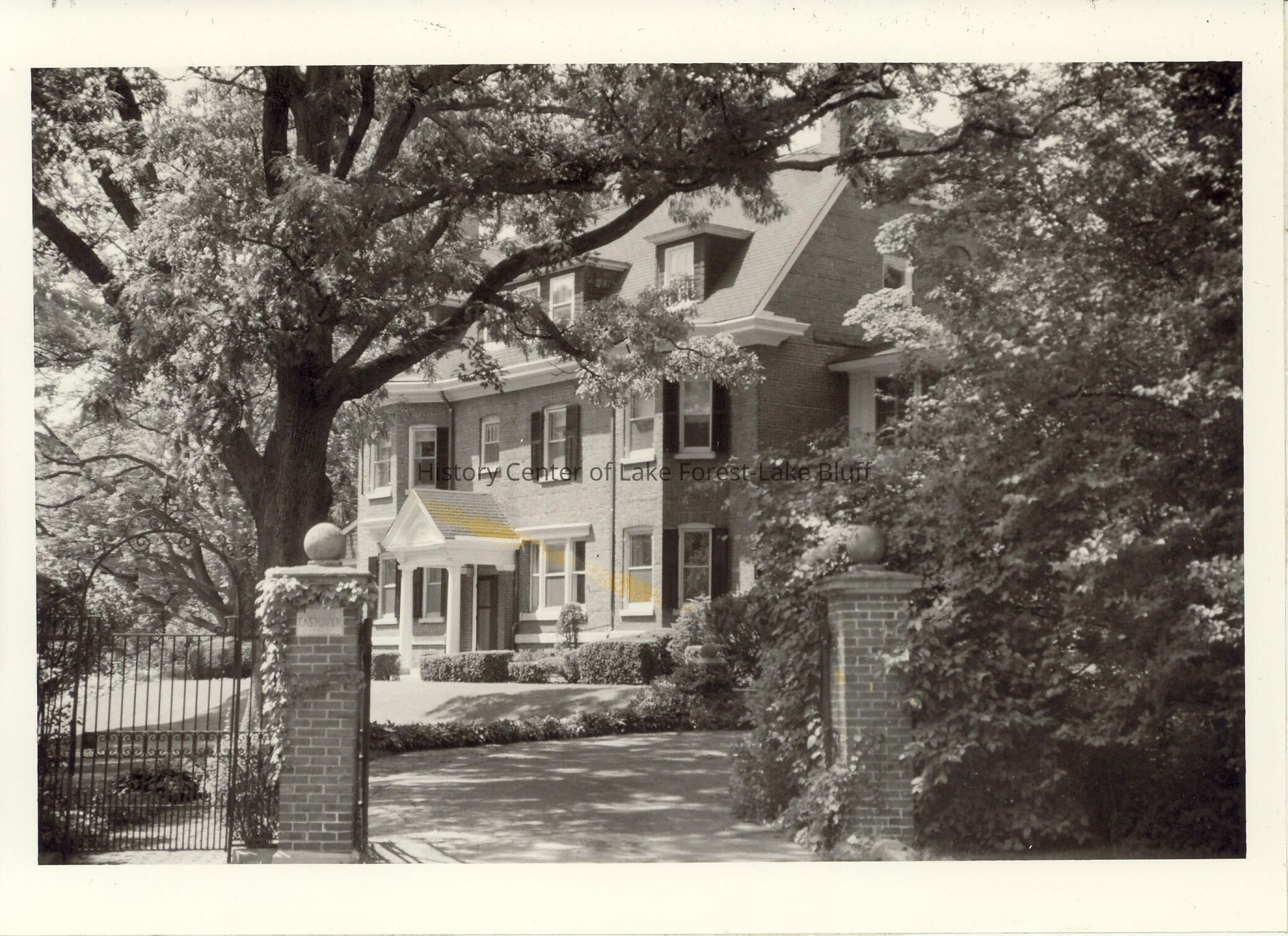three-story brick structure with brick pillars at side of driveway Eastover 880 Elm Tree Road Lake Forest Charles Sumner Frost and Mary Hughitt Charles Sumner Frost 1897