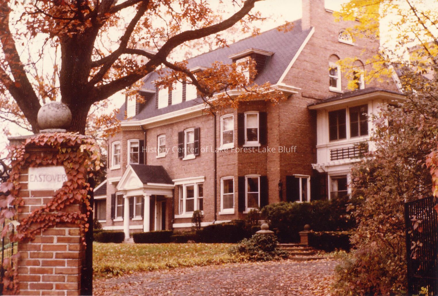 three-story brick structure with "Eastover" engraved in foreground pillar Eastover 880 Elm Tree Road Lake Forest Charles Sumner Frost and Mary Hughitt Charles Sumner Frost 1897